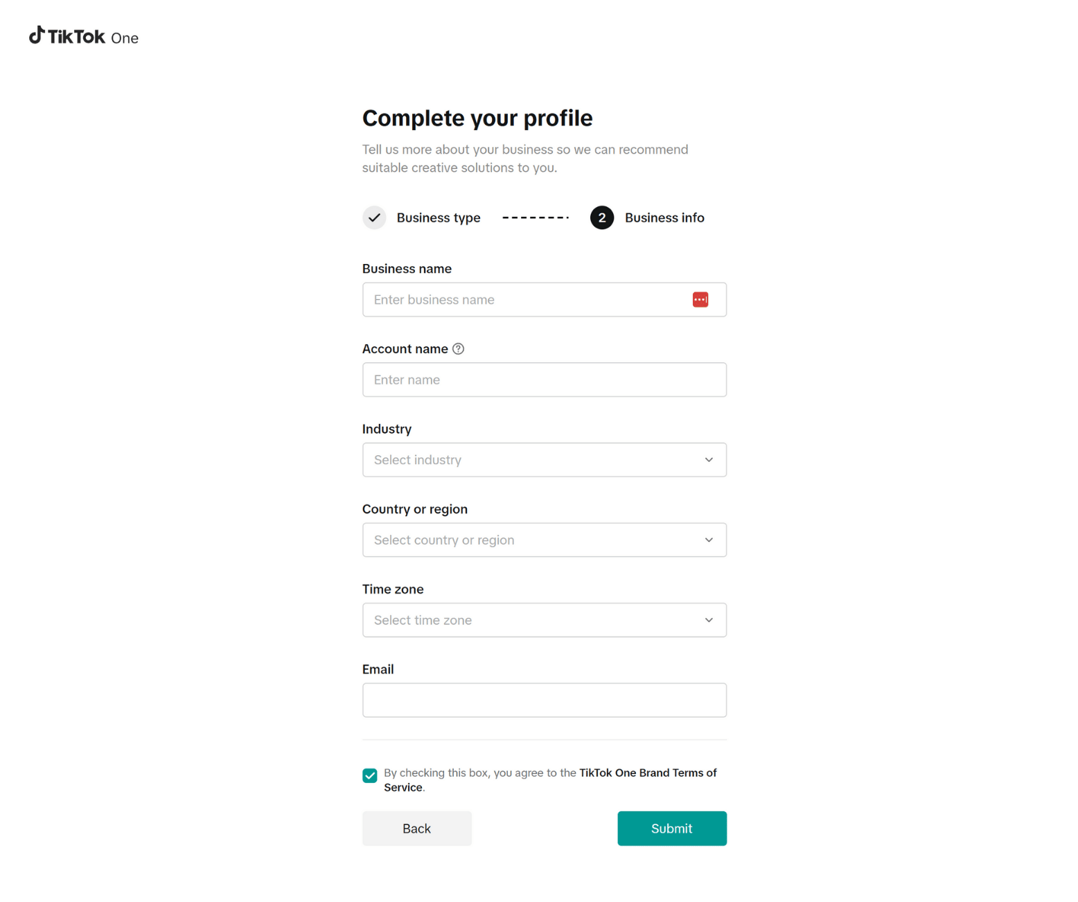 Click ‘Submit’ at the bottom of the registration form to finish creating your TikTok Creator Marketplace account.