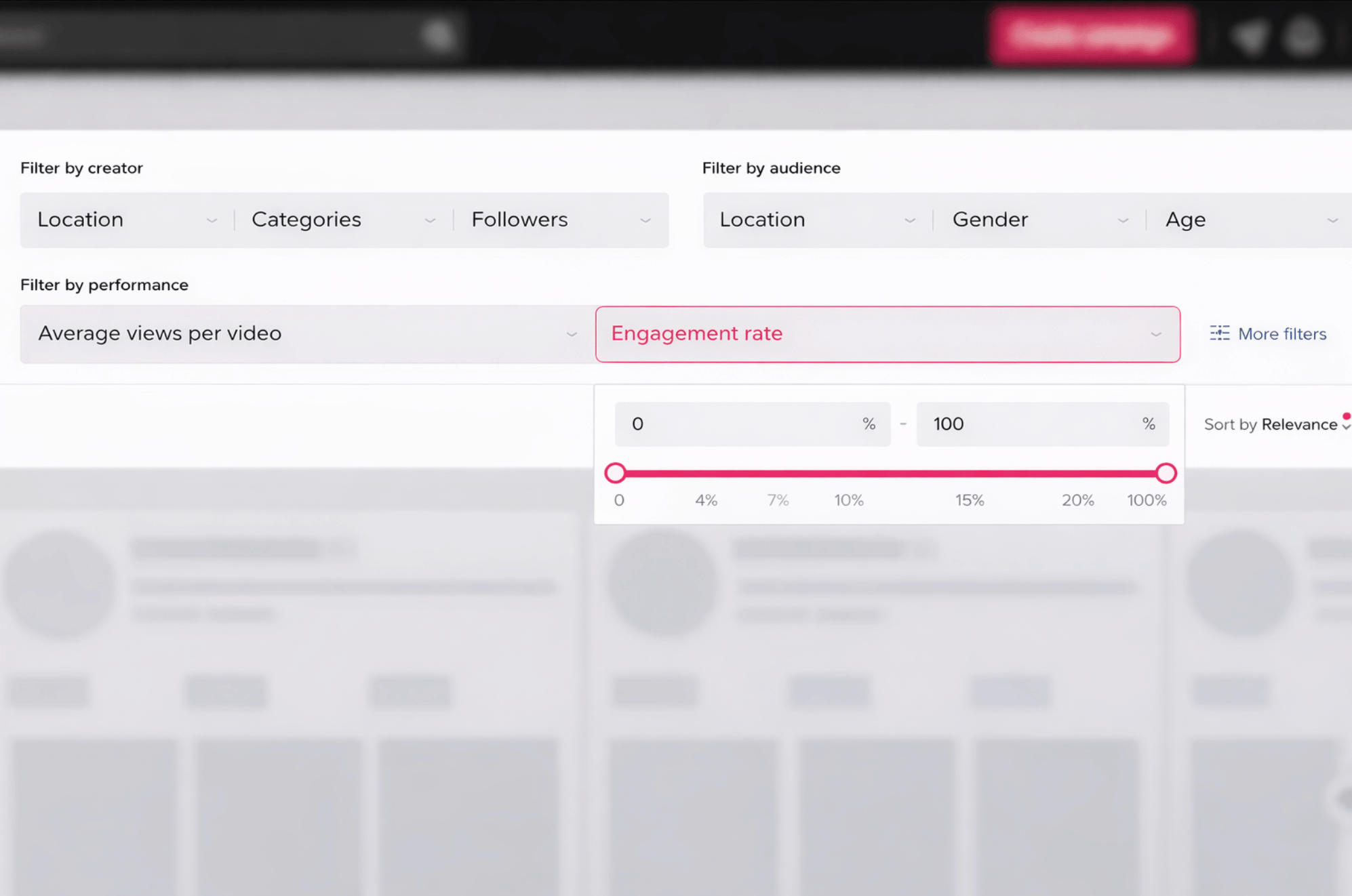 Under “Engagement rate,” specify the engagement rate range you want from your partner creator. Engagement rate is measured as a percentage value (0-100%).