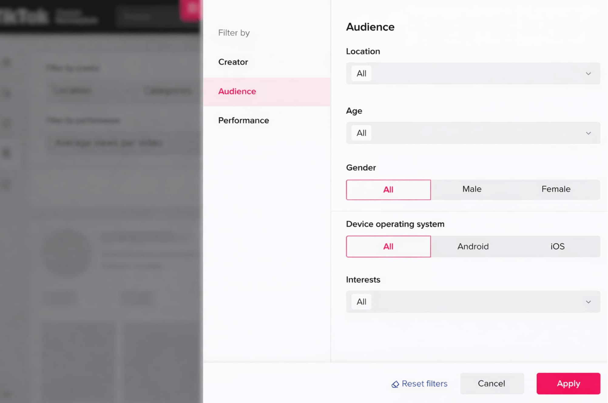 If you click ‘More filters,’ an advanced filters panel will appear on the right. Switch to the ‘Audience’ tab to access additional filters, namely “Device operating system” and “Interests.”