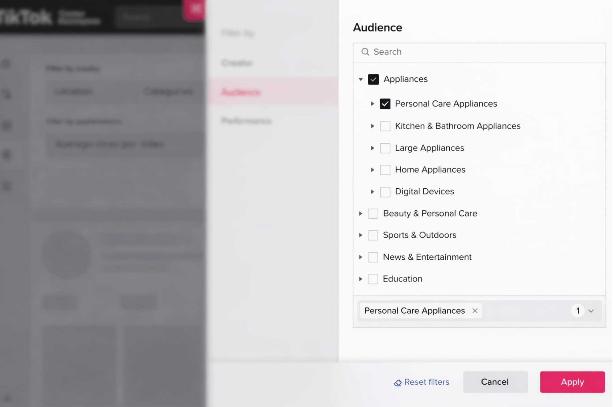 Under “Interests,” select relevant niches that position your brand or product to the right audience. Be as specific as possible to narrow down your campaign’s target audience and maximize your TikTok influencer marketing budget.