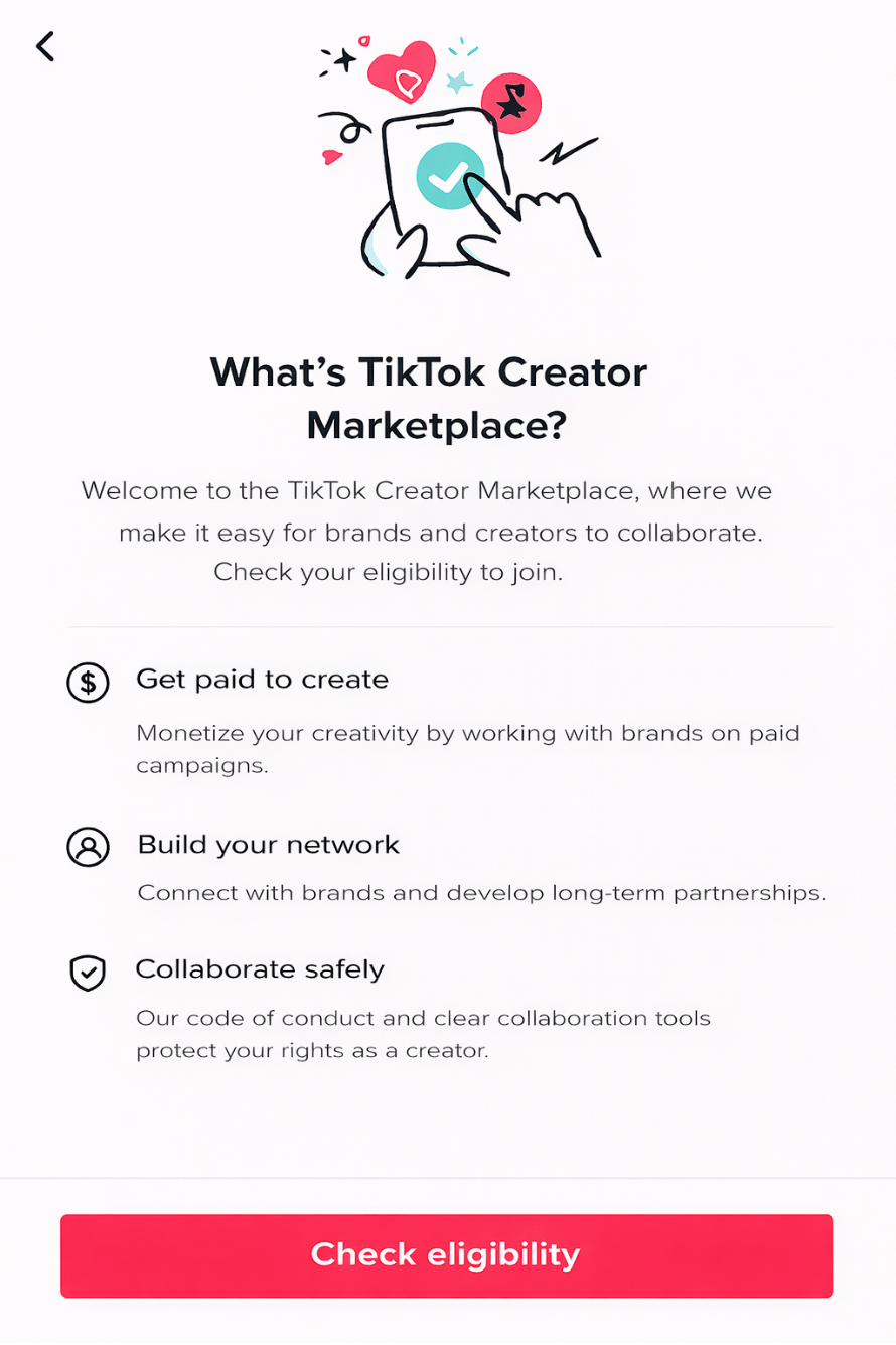 Tap ‘Creator Marketplace’ under “Creator Next.” On the TikTok Creator Marketplace page, tap ‘Check eligibility’ to verify if you’re qualified to join.