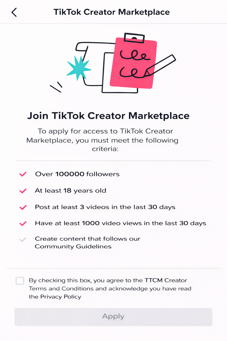 TikTok pre-screens users who meet the basic TikTok Creator Marketplace requirements. If you do, use the checkbox below to agree to the TikTok Creator Marketplace Creator Terms and Conditions. Also, ensure that you read the TikTok Privacy Policy before tapping ‘Apply.’