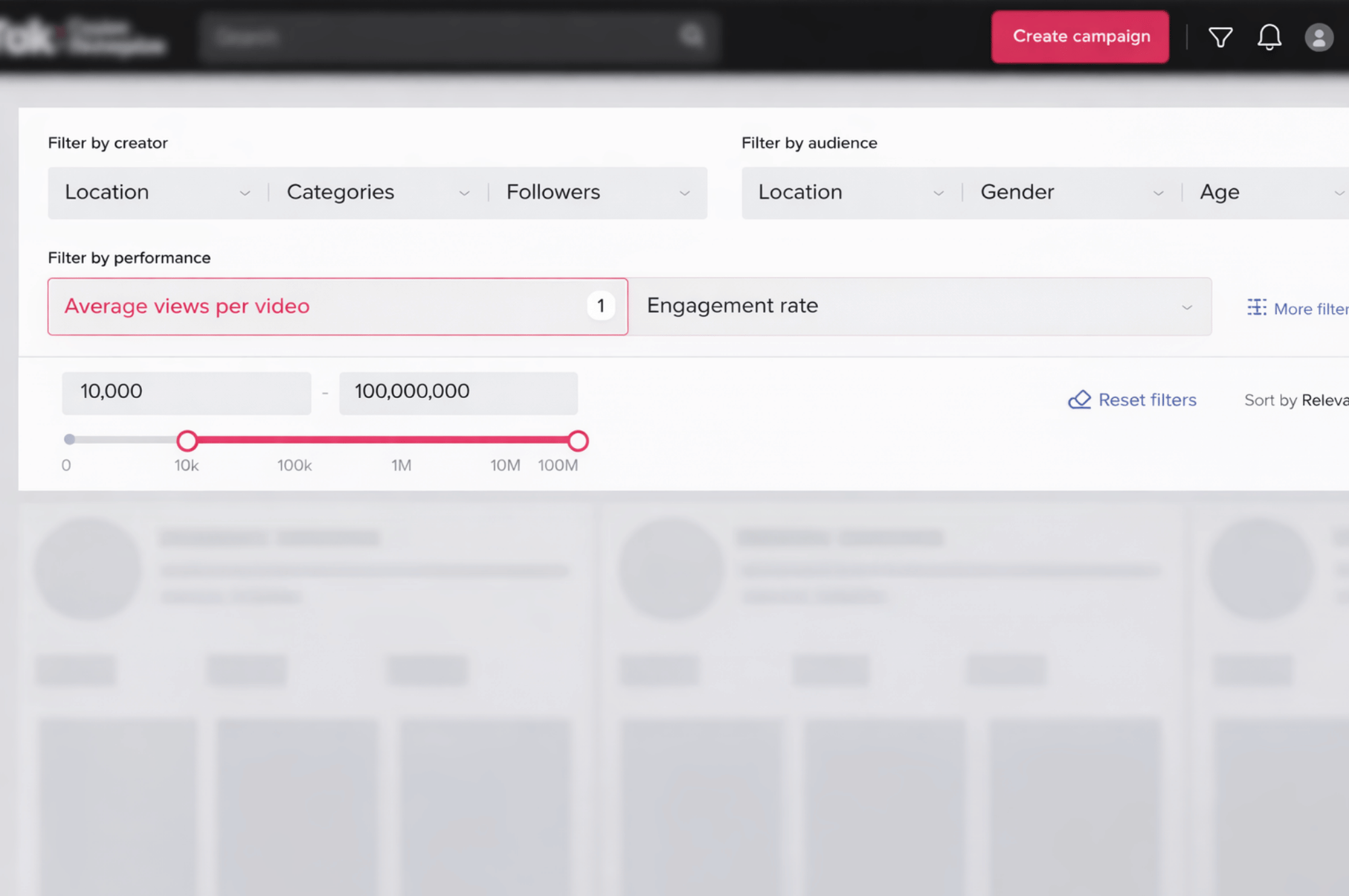 On TikTok Creator Marketplace, use filters to find influencers who are great at generating engagement. Under “Average views per video,” use the slider to specify the range of views you expect from your partner creator.