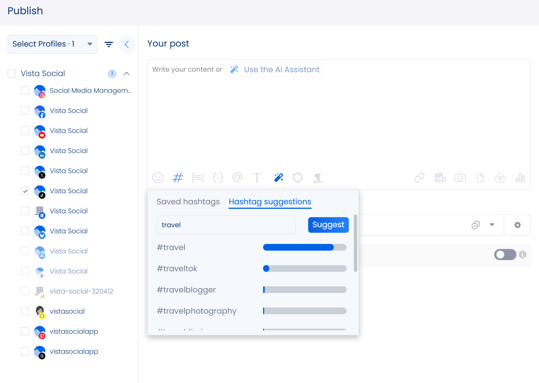 And you can easily discover this information right in Vista Social! For maximum impact, try out the hashtag feature, which can generate dozens of trending and viral TikTok hashtags based on a simple keyword search.