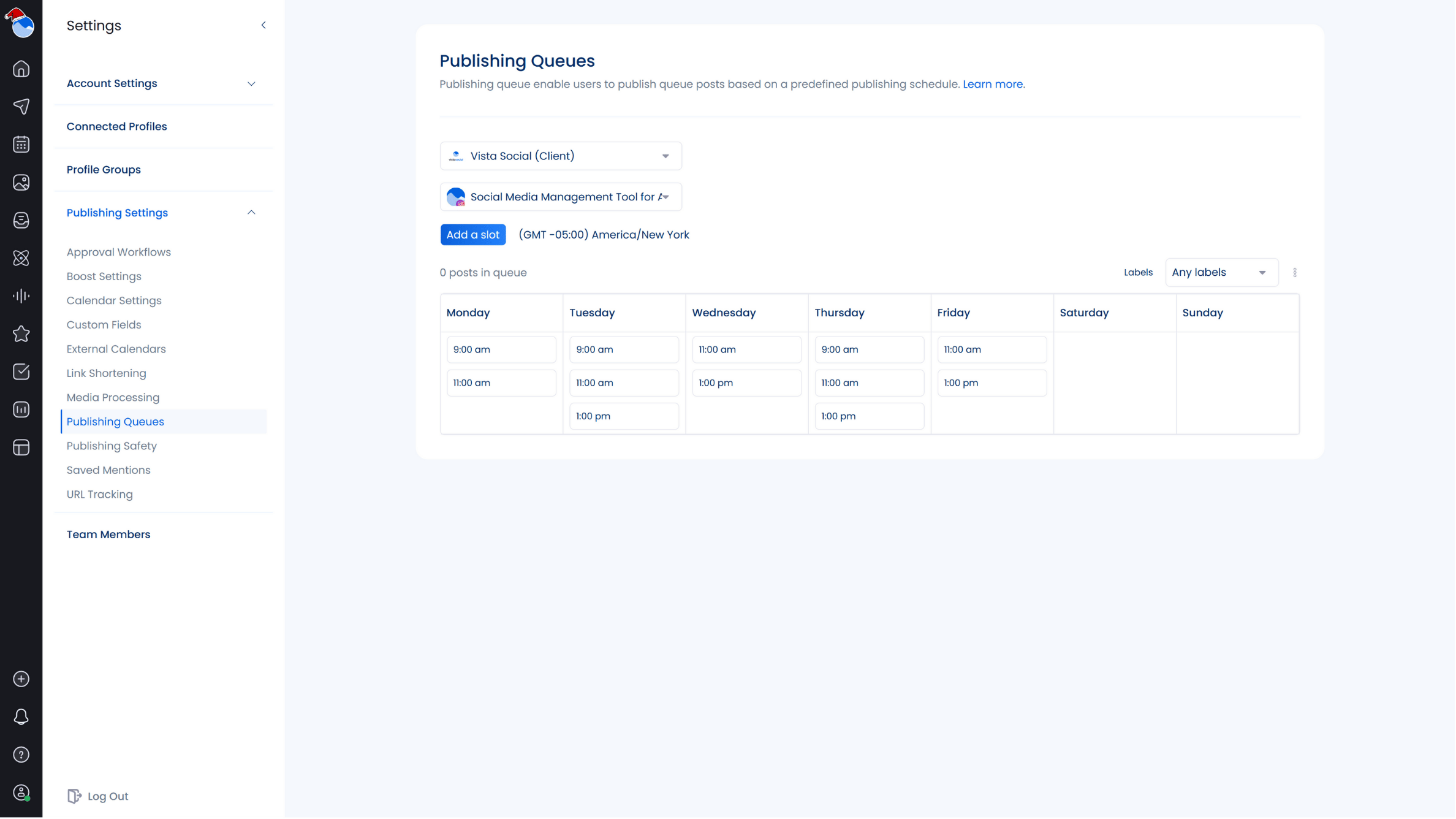 Our intuitive scheduling feature makes it easy to create queues that align with your target audience’s active hours. Simply choose the times that make the most sense for your brand and let Vista Social handle the rest.