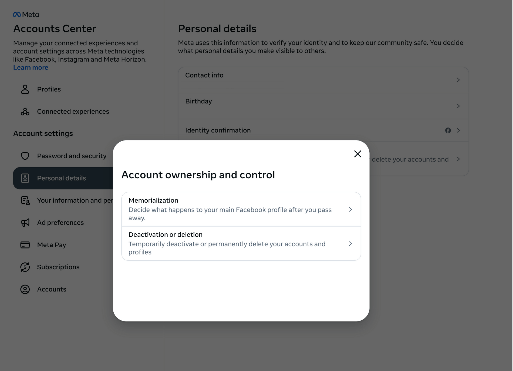 After you unlink the accounts, open Accounts Center, go to Personal Details, then select Account Ownership and Control. Most people now find the deactivation option inside Meta’s Accounts Center. Some accounts still surface an in-app shortcut, although Instagram doesn’t guarantee it for everyone. Accounts Center remains the dependable place to manage deactivation controls.
