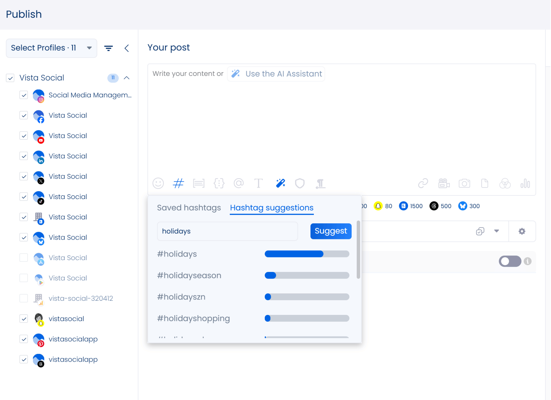 - Find relevant and popular hashtags in your clients’ industry or niche based on specific topics and keywords in a flash to boost their content’s searchability and chances of getting featured by the algorithm. Use Vista Social’s free AI hashtag generator for social media to get hashtag suggestions in seconds.