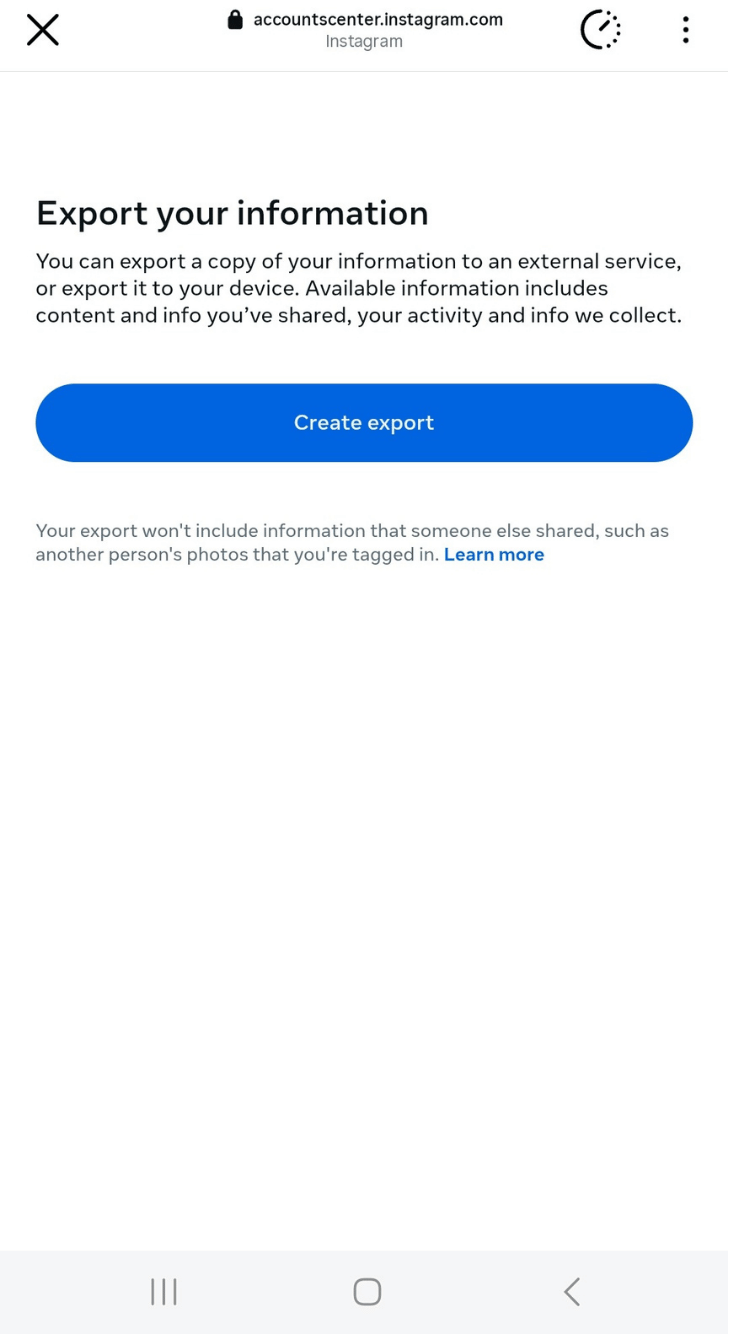 Step 3: On the next page, tap ‘Export your information’ to request a copy of your (or your client’s) account data.