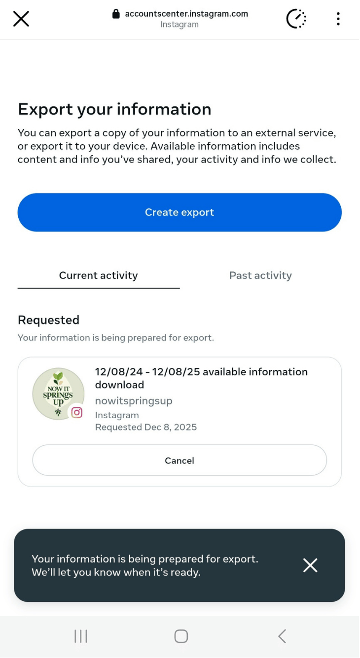 Tip: Instagram still uses time-limited download links, and users typically get a four-day window to access their exported data. After that expires, Instagram requires you to submit a new request for a fresh export.