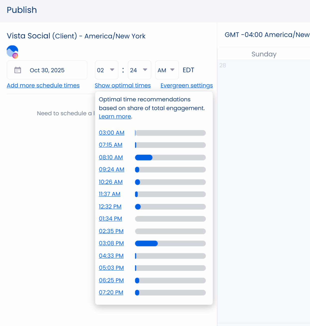 With Vista Social, you skip all the guesswork and save yourself a lot of time trying to figure out the right posting window. Just pick from the suggested times, and you’re good to go.