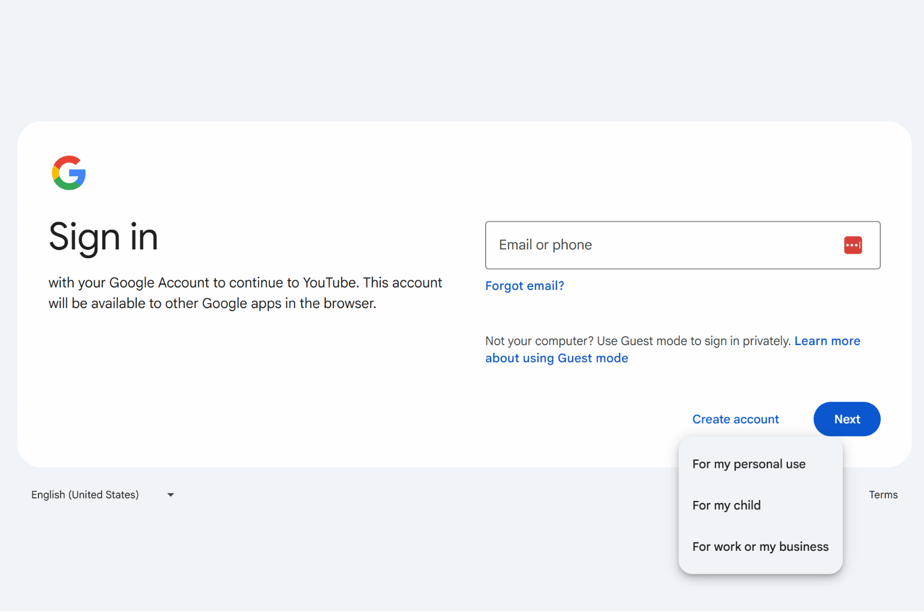 - Open YouTube and sign in to the Google account you want to use. If you’re already signed in to a Google account and want to use another one, click the account icon and select Switch account > Add account.