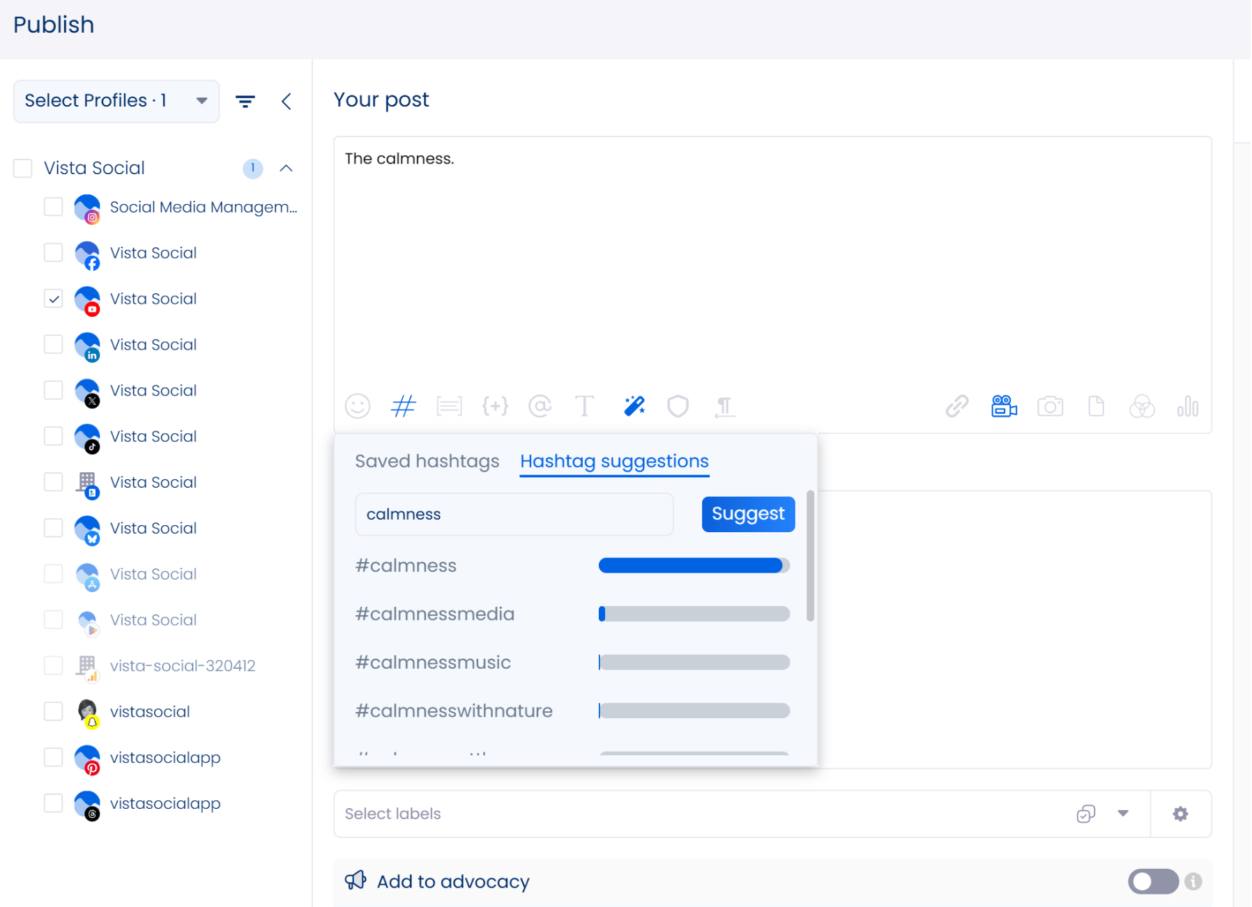 For instance, you can use the Publisher to share a YouTube video on Instagram Story automatically. Say goodbye to manually searching for hashtags for your client’s posts with Vista Social’s AI hashtag generator. If you need a quick reference guide, check out these YouTube Shorts hashtags so you can plan stronger tagging strategies for Shorts content.
