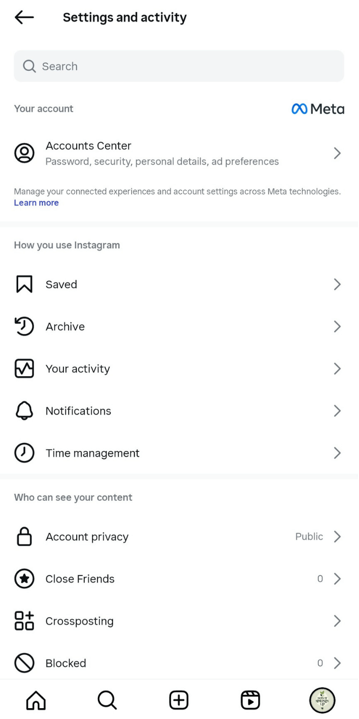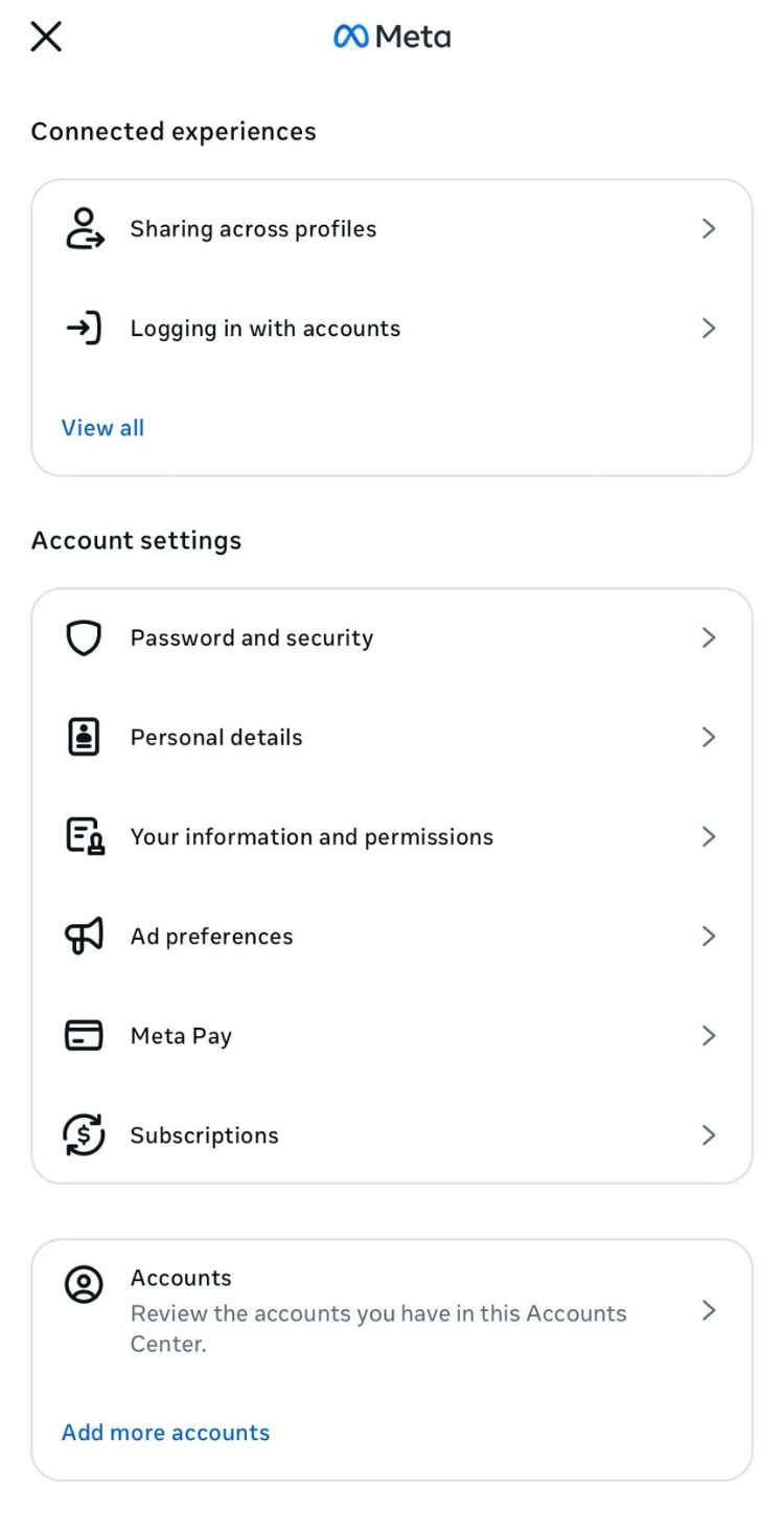 - Select Settings and tap See more in Accounts Center under the Meta Accounts Center section.