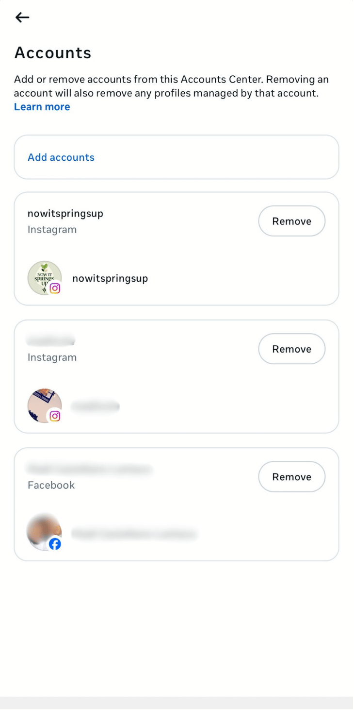 - Tap on Accounts and select the Remove button beside the Instagram account your client wants to unlink from Facebook.