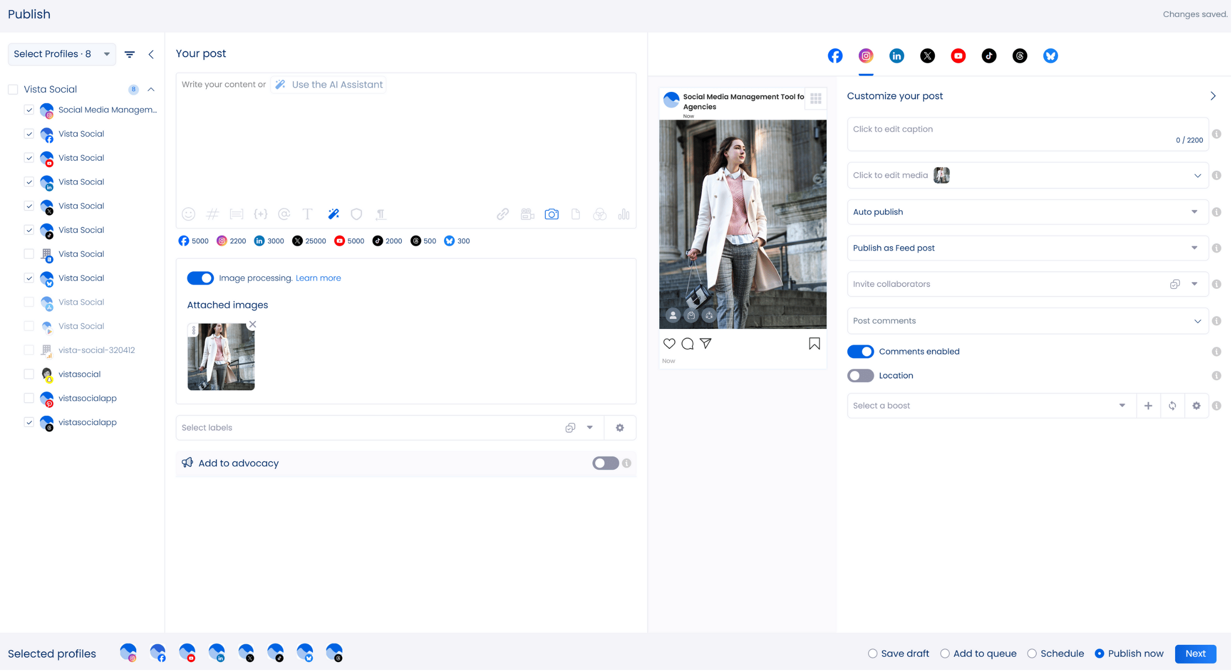 Handling your clients’ activity on Facebook, Instagram, along with their other social spots can drain your energy fast. Vista Social turns that workload into something you can manage without stress. The social media management (SMM) platform’s modern features simplify and streamline your tasks, from scheduling content for auto-posting to managing audience engagement efficiently.