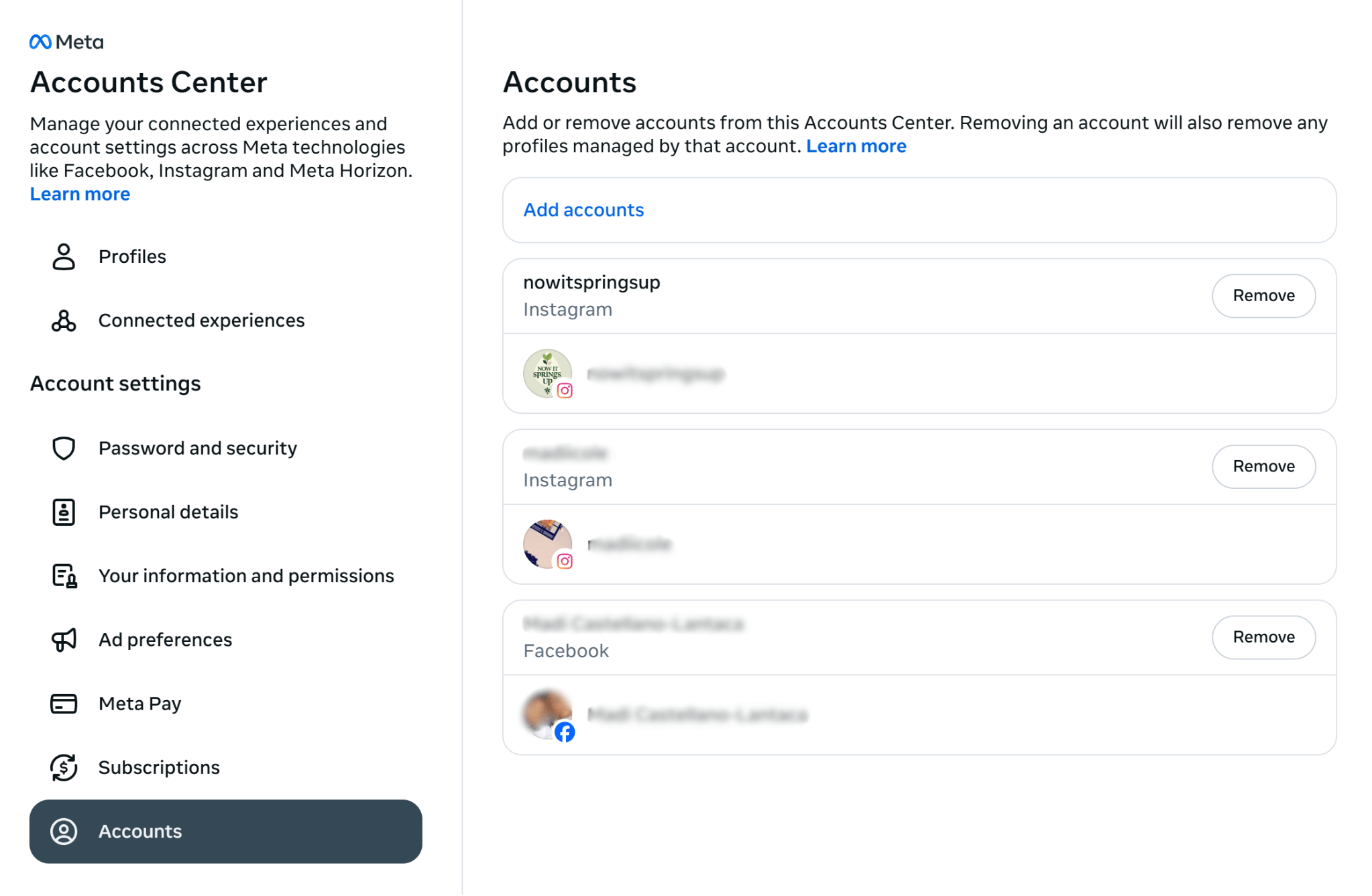 - Click Accounts and remove the Instagram account your client no longer wants to be linked to their Facebook account.