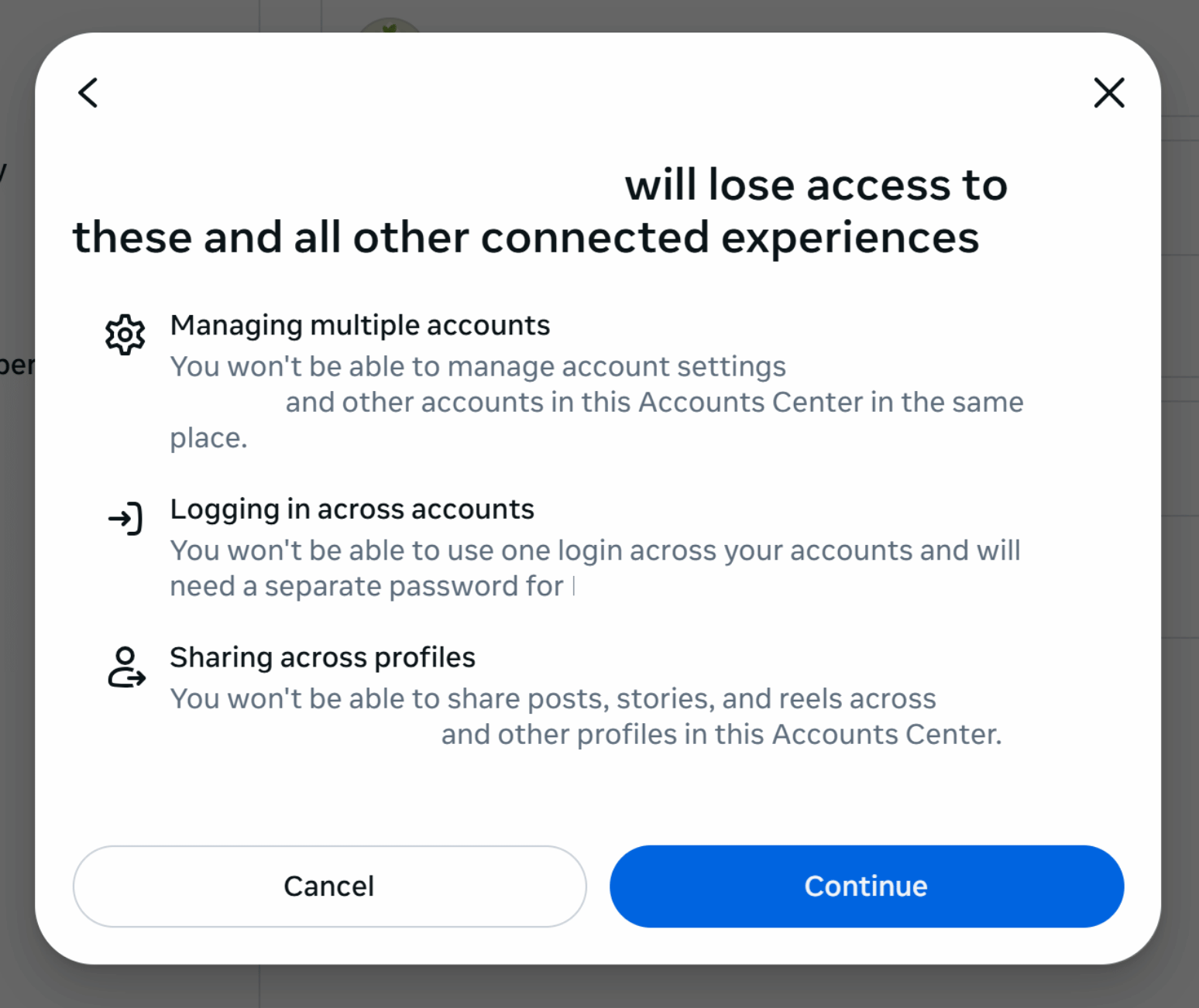 Click Continue to confirm removing the account in your client’s account center, and voila! Your client’s Instagram is unlinked from their Facebook account.