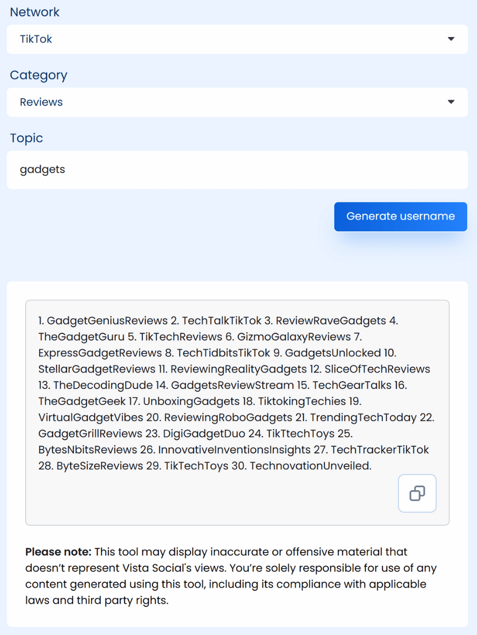 - Vista Social includes an AI-powered username generator that helps you quickly brainstorm TikTok username ideas based on your clientâs niche and brand style. Choose a category and topic, and the tool instantly generates a list of TikTok usernames.