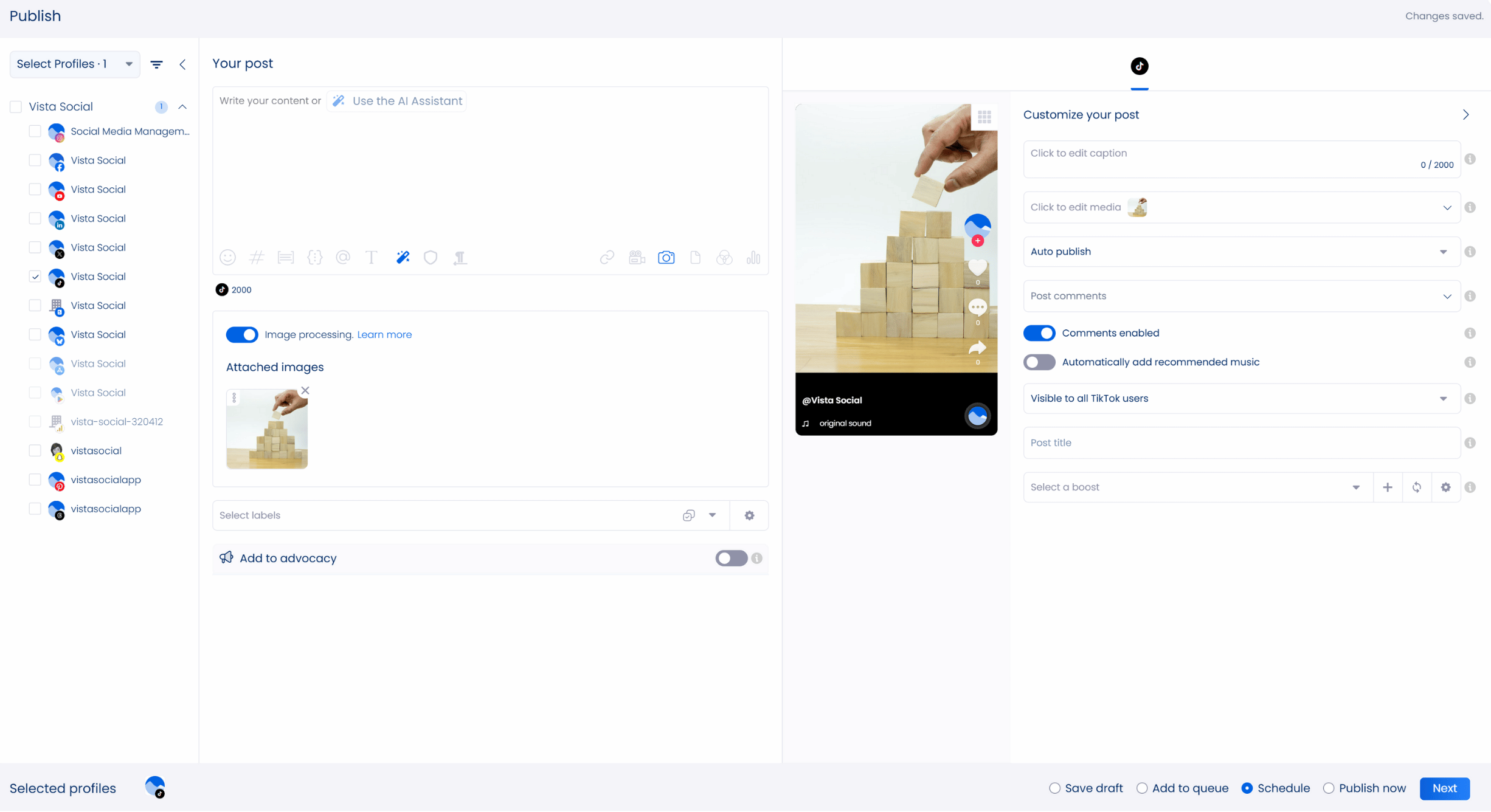- Vista Social lets you plan and schedule TikTok posts ahead of time, making it easier to keep your content publishing organized and aligned after username or profile updates. Link your clientsâ TikTok accounts, then create and customize posts while setting up an optimal auto posting schedule to drive stronger engagement.