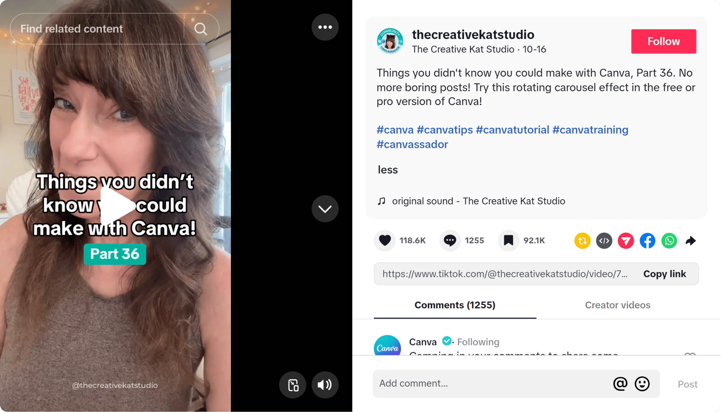 Keep your branded hashtags short and to the point. For instance, you can use #canvatips if the TikTok challenge is for creators to share videos of them sharing Canva tips and tricks or lesser-known features that every user should know.