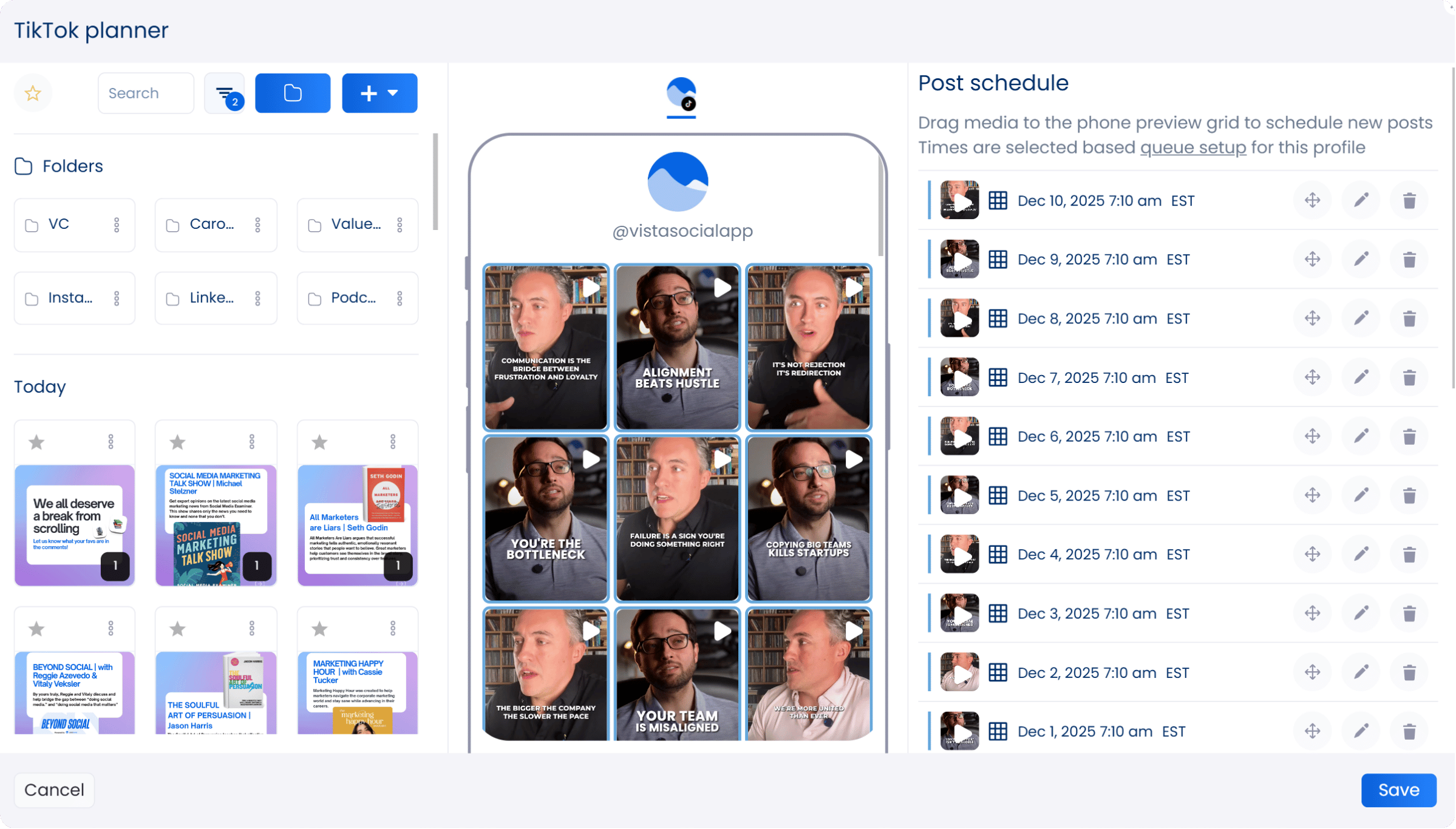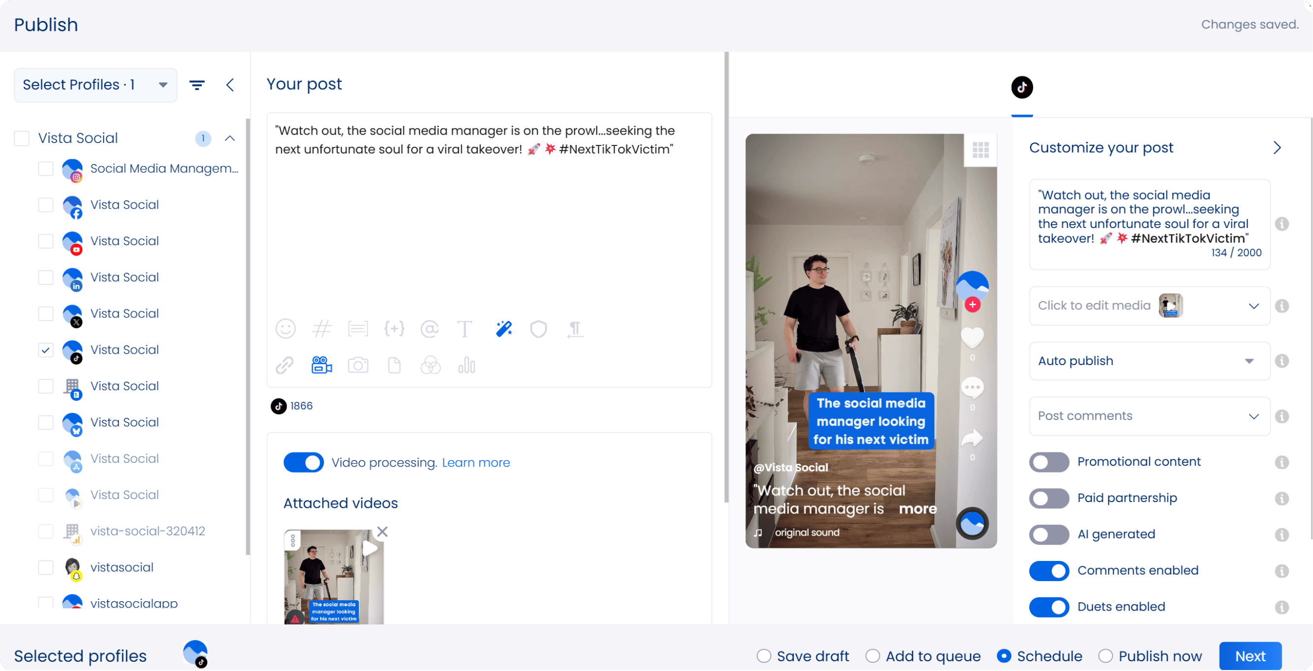 Effectively generating audience engagement means regularly posting content, including TikTok challenges. Plan and schedule your TikTok and other social media content while managing multiple profiles efficiently with Vista Social.
