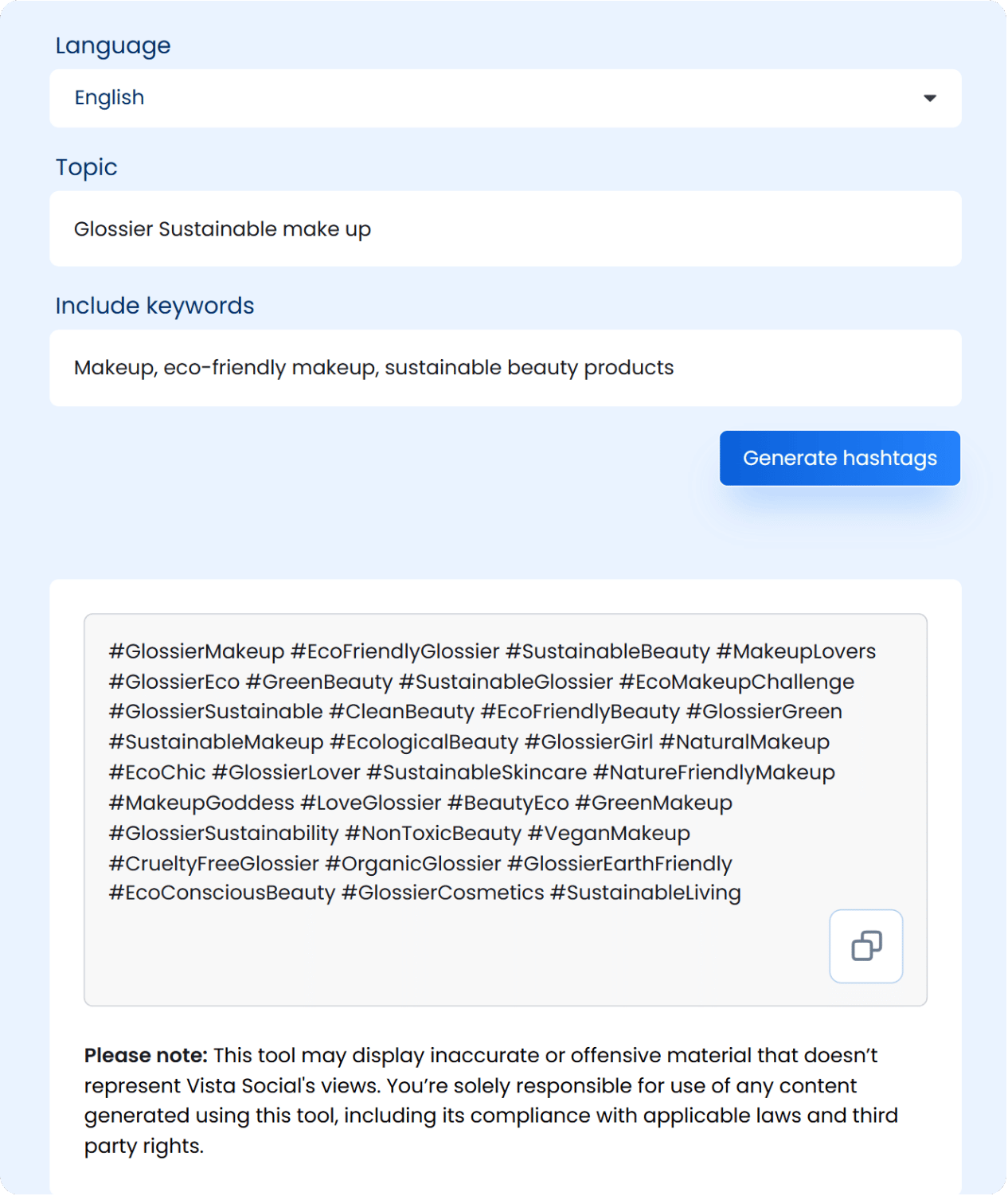 Need help coming up with catchy branded hashtags? Use Vista Social’s free AI hashtag generator. Share some details, and the tool will instantly generate hashtags for you.