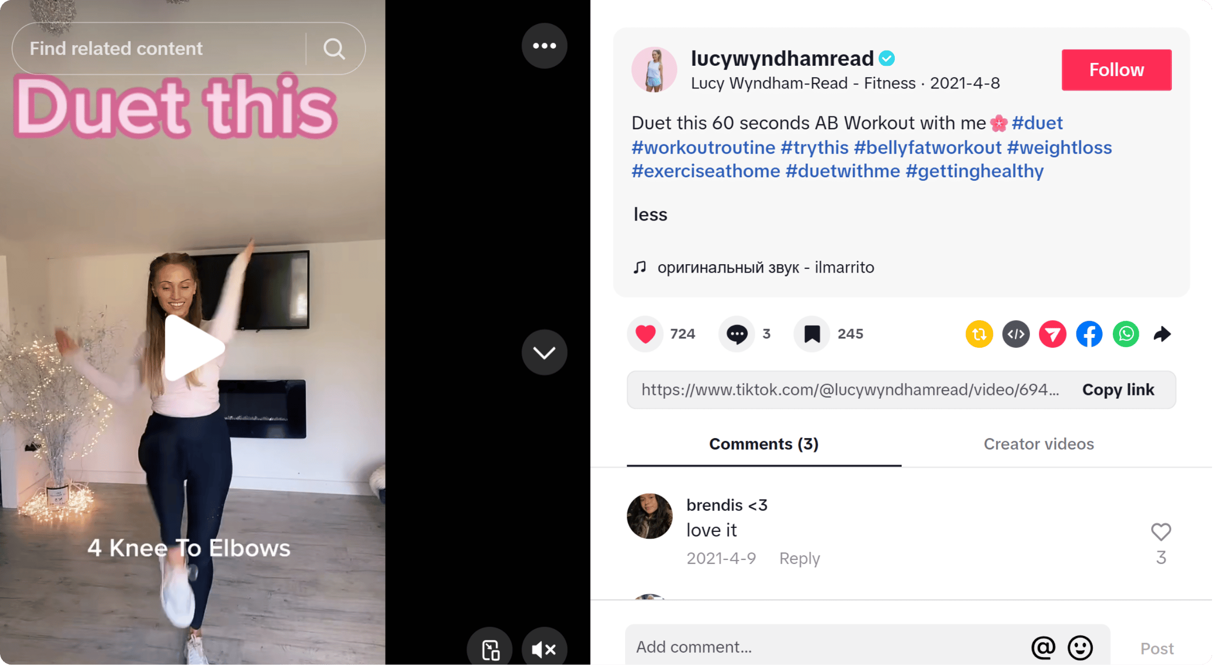 Besides Stitches, you can also start TikTok challenges where other users can duet with your videos. For example, you can challenge audiences to duet your workout routine, turning your content into interactive fitness fun.