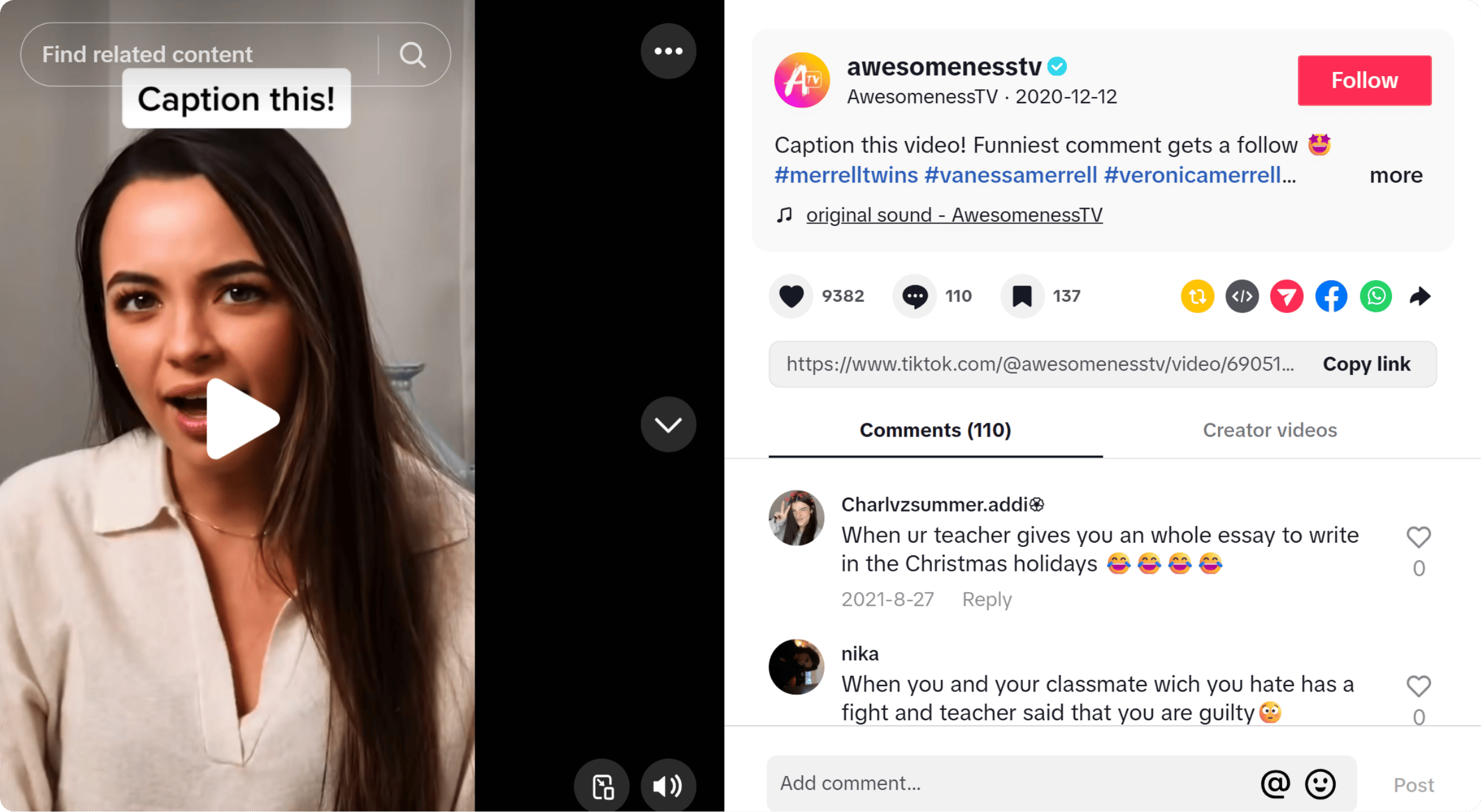 Run TikTok challenges doubling as contests to encourage audience interaction and engagement. For example, get your audiences involved in creating video captions or TikTok quotes for your content.