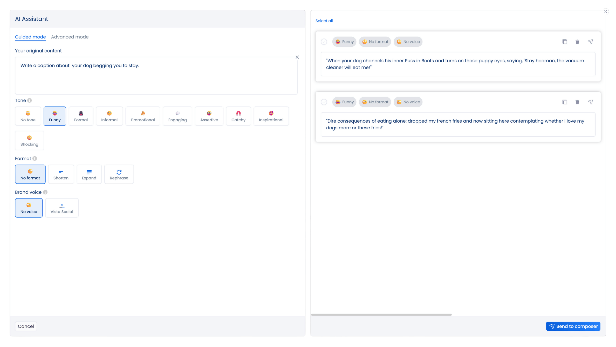 - A ChatGPT-powered AI Assistant that generates captions, descriptions, and taglines for your clients’ posts instantly based on your prompts.