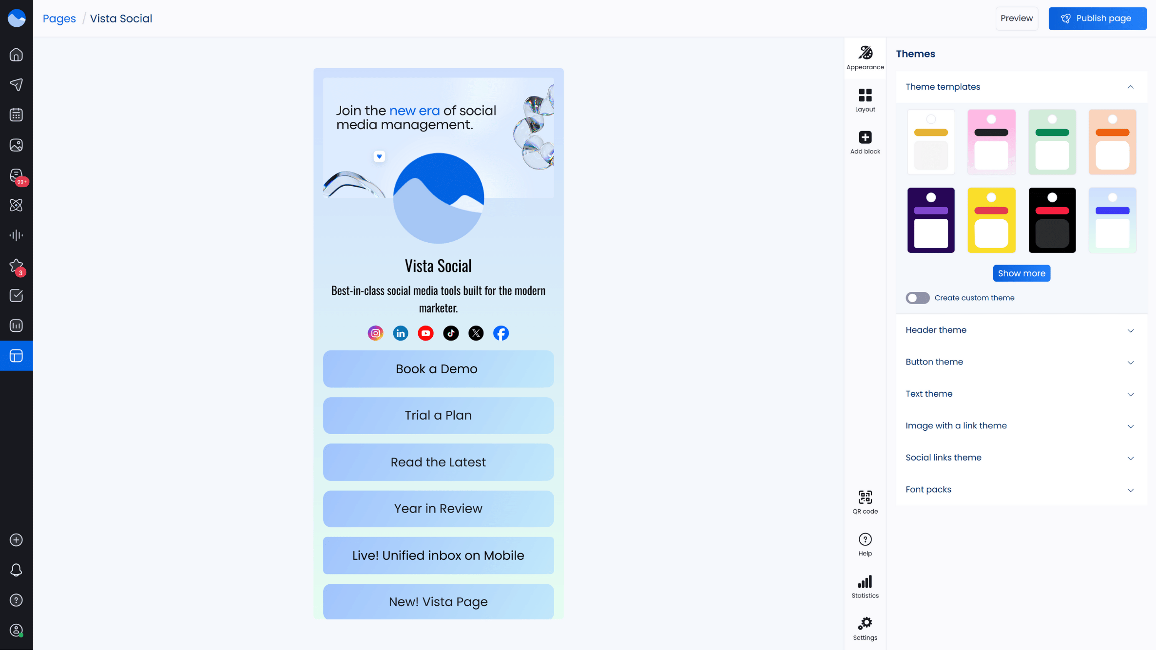 - A link in bio tool that comes with customizable landing pages for your clients’ brands, products, and services called Vista Page.
