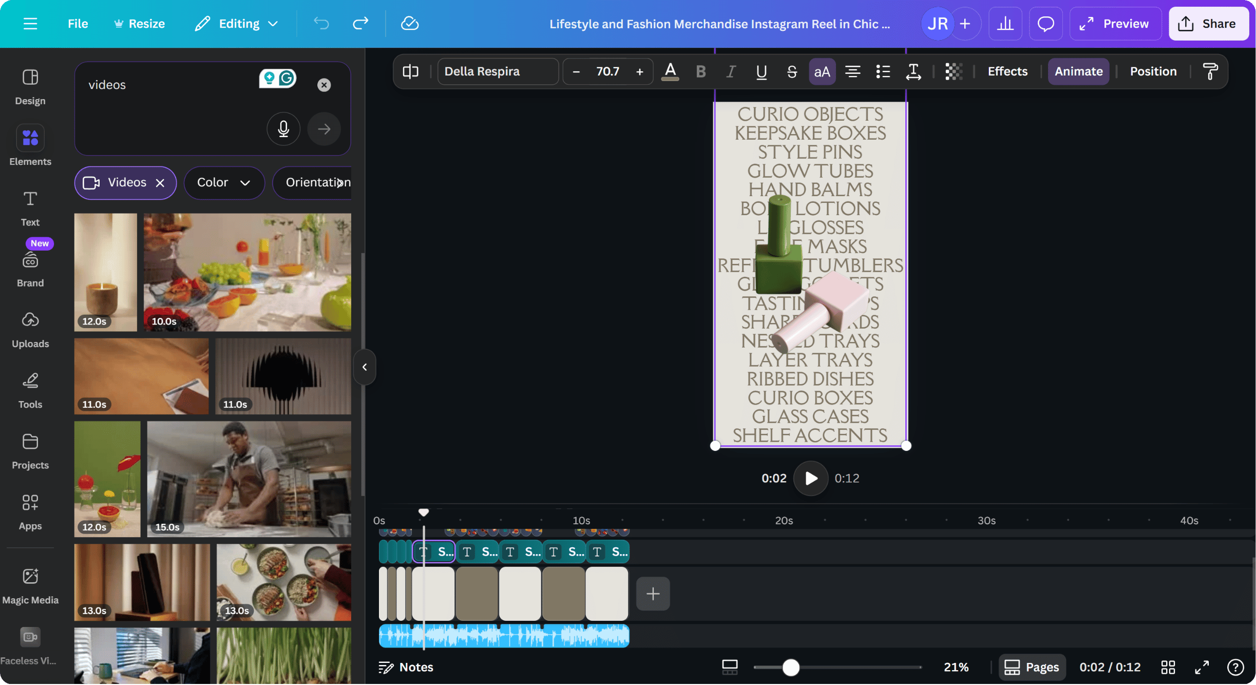 Using Canva lets you use advanced video editing and design tools to quickly create Reels. The drag-and-drop editor lets you add quick animations and a variety of other design elements within seconds.