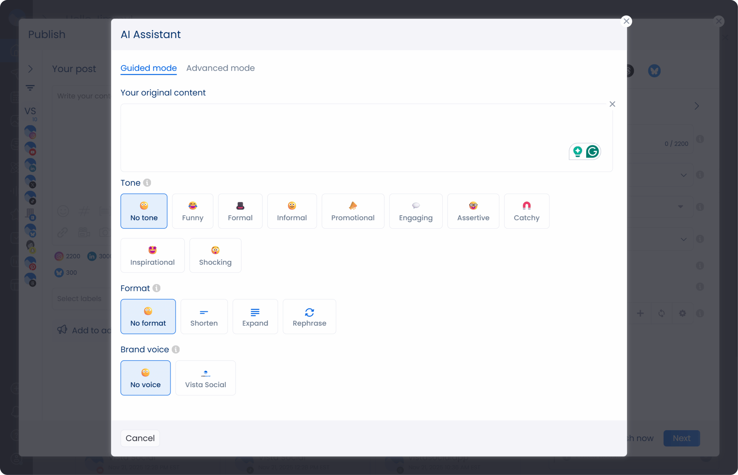 With Vista Social, you can prepare and plan your Instagram Reels captions ahead of time. Use the AI assistant to instantly generate captivating captions based on your brand preferences.
