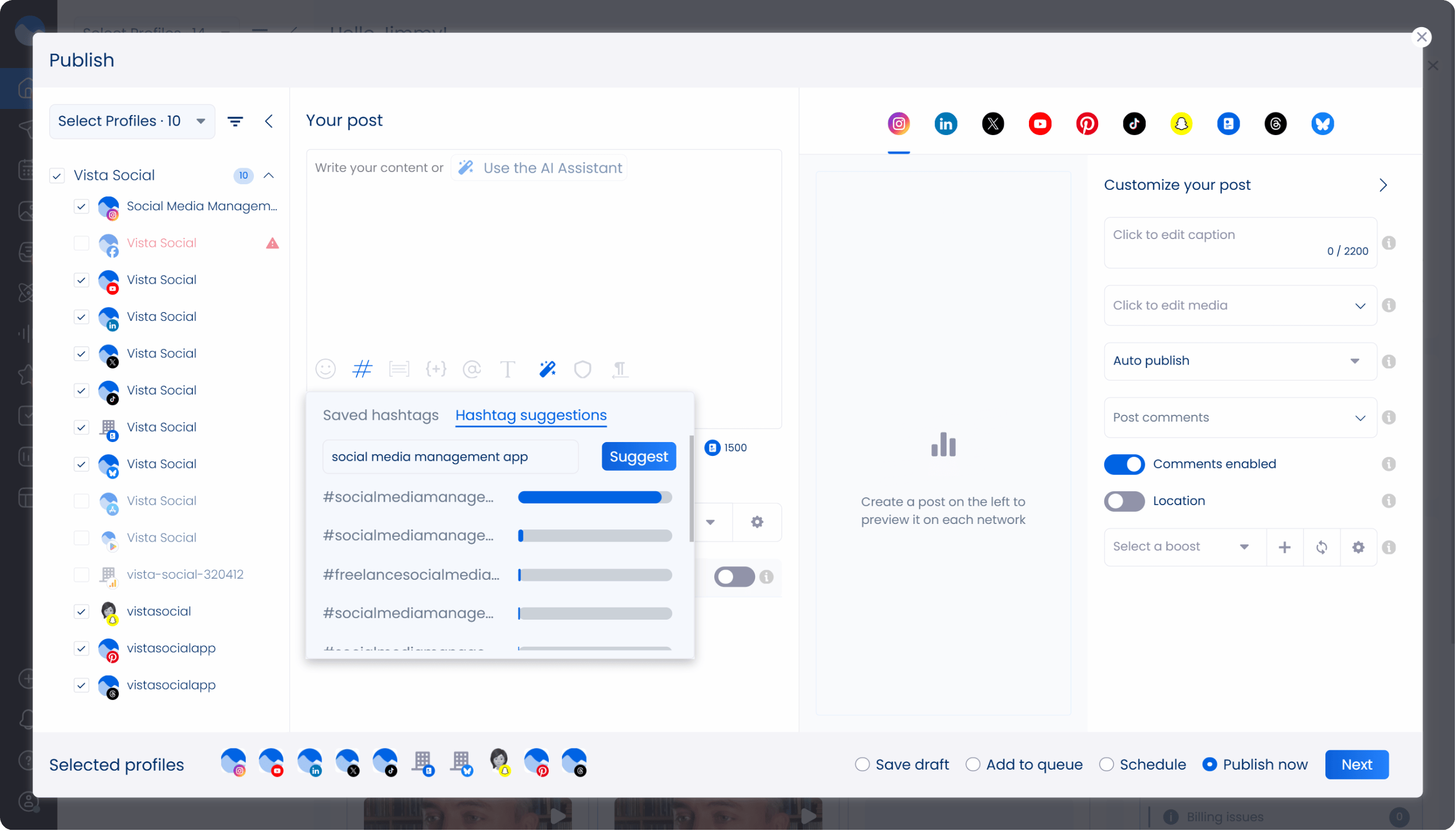 To make your caption more relevant and searchable, Vista Social can also provide useful hashtag suggestions. No need to look for a separate hashtag or keyword research tool.