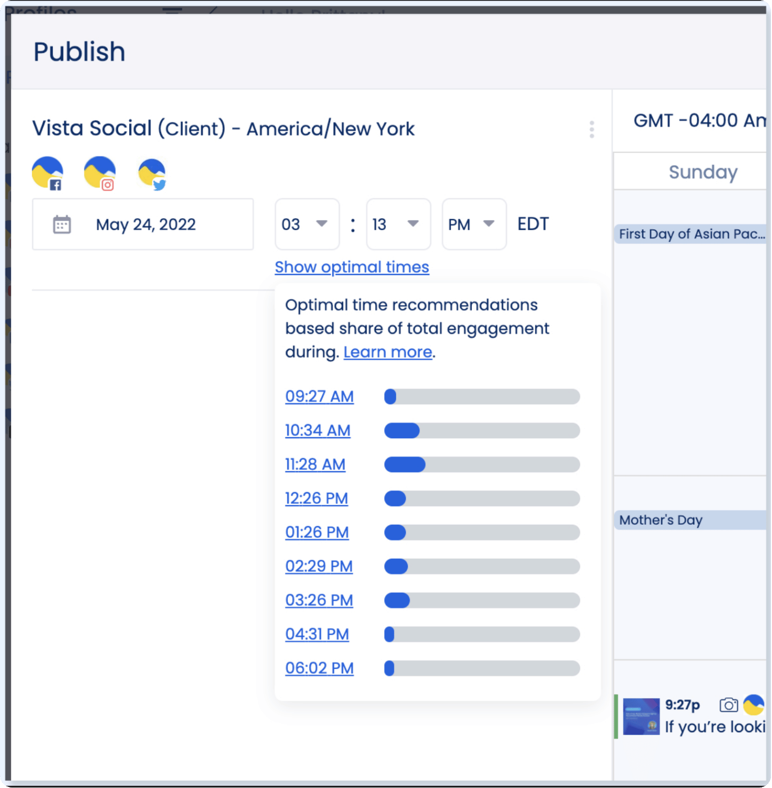 Just click ‘Show optimal times’ when scheduling through the publisher to see the best posting times for your content.