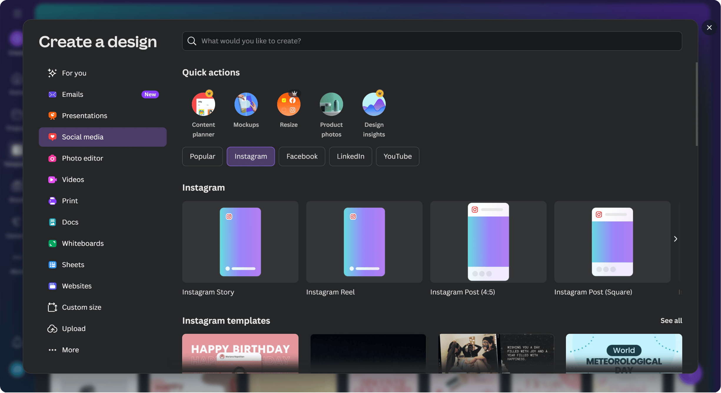 Finally, you’ll also find Instagram Reels templates on design websites like Canva. Just go to ‘Templates’ from the main menu, select ‘Social Media,’ and click ‘Instagram Reel.’