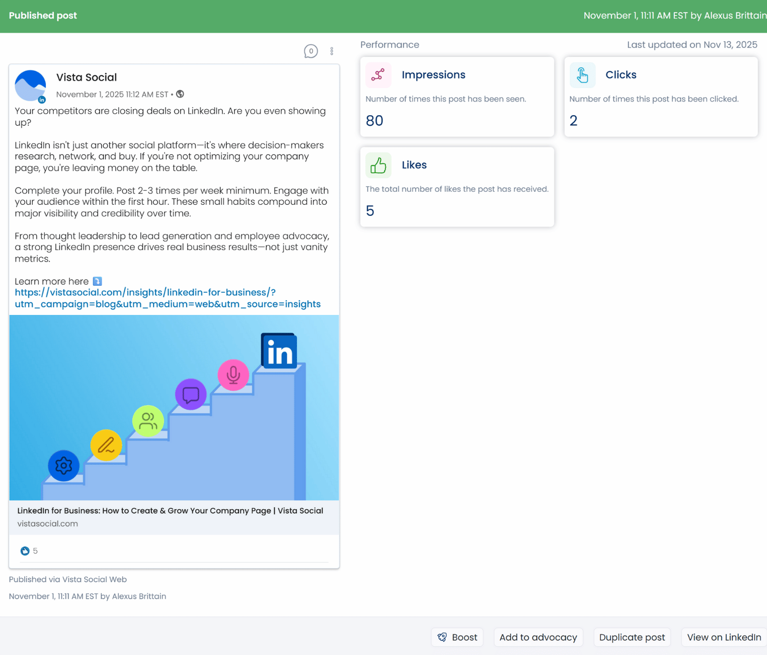 It’s not just about seeing the big picture, Vista Social also lets you dig into individual post performance to see which content resonates best with your audience. After a post goes live, you can open it in the content calendar to check detailed performance stats and engagement insights.