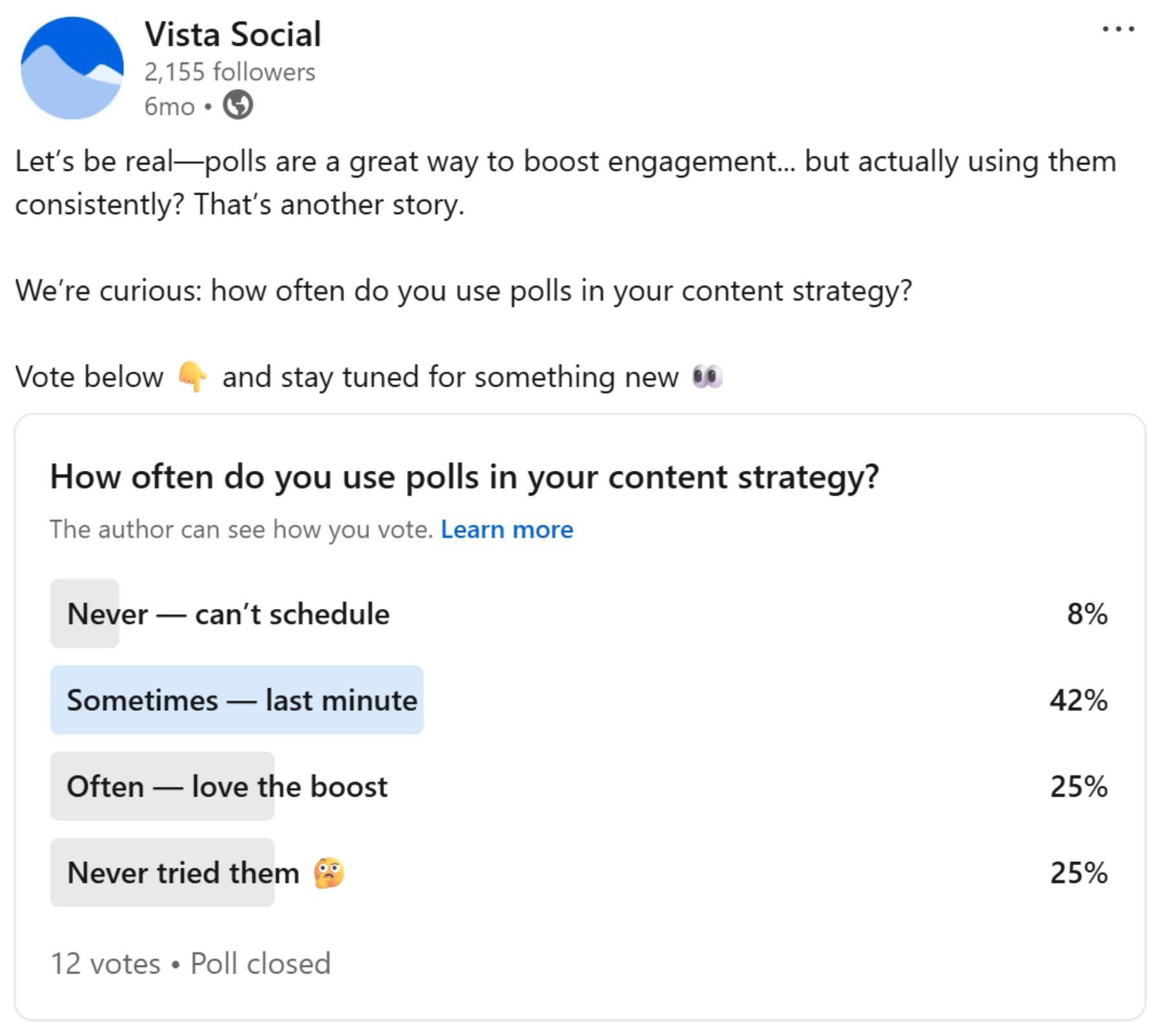 Polls are one of the easiest ways to spark conversations on LinkedIn. Create polls that tap into your audience’s curiosity or experiences so they’ll want to share their opinions. It’s a quick way to boost visibility while learning more about what people care about most.