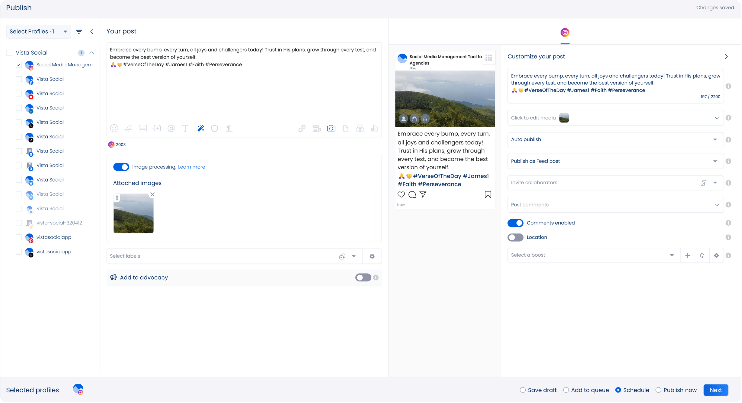 Use the AI Assistant in the Publisher to generate engaging post descriptions and taglines quickly. After setting up your posts, choose a schedule that works best for your clients and let Vista Social handle the publishing automatically. The process feels seamless, freeing up more of your time to focus on building stronger connections through meaningful content.