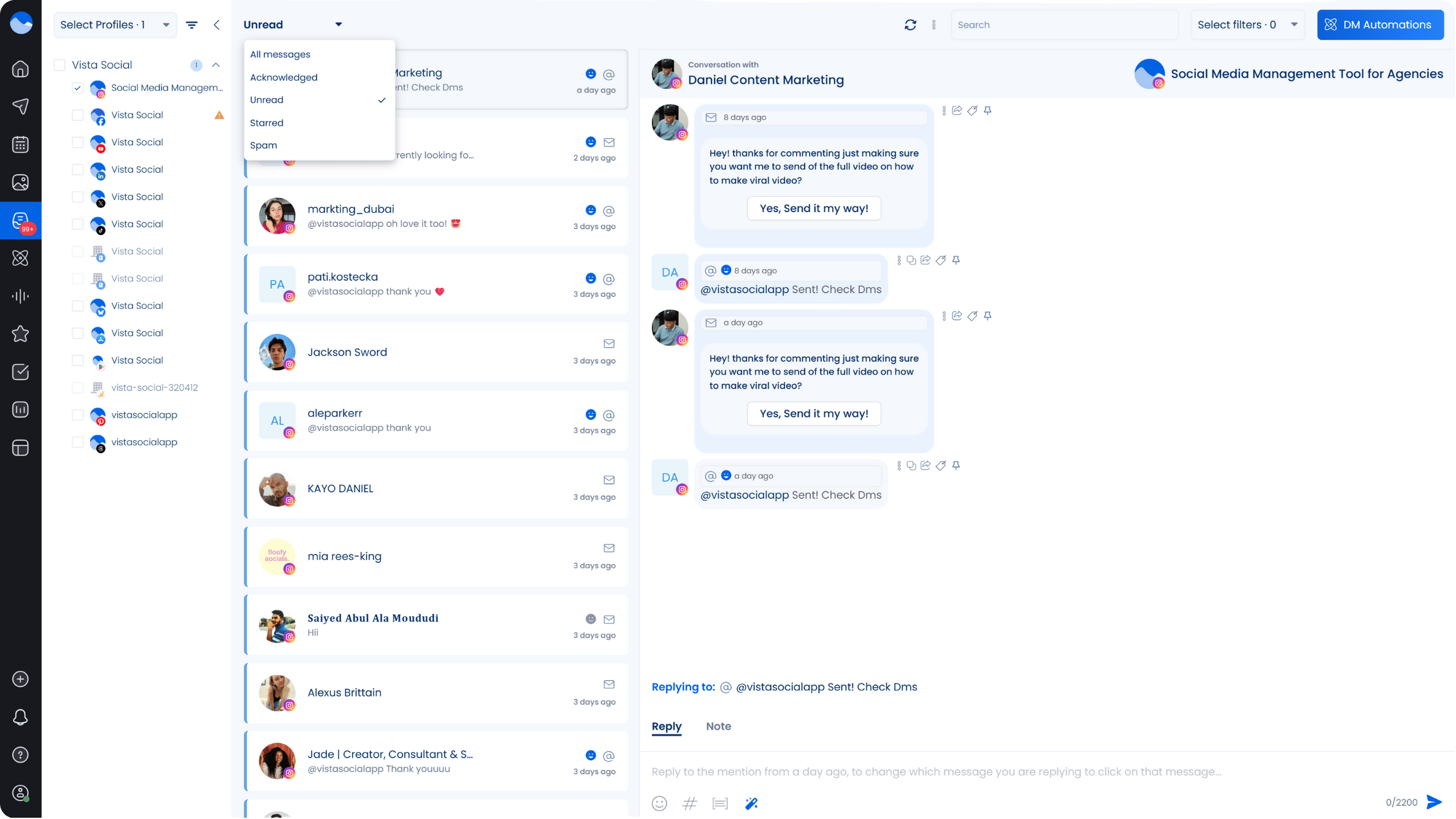 Manage your clients’ engagement like a boss with Vista Social’s social media engagement feature. It includes a unified Social Inbox that gathers everything your clients receive into one space so you can manage all activity more easily.