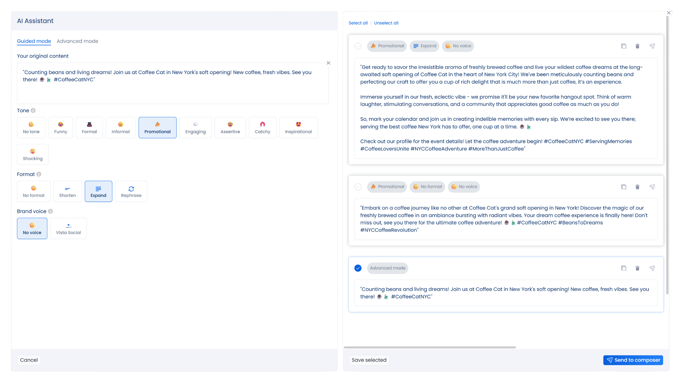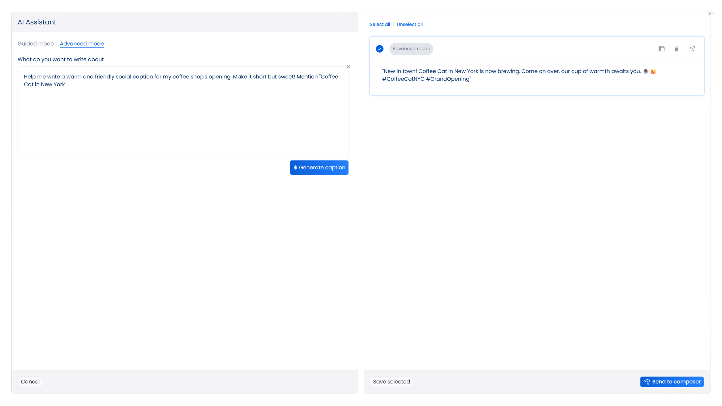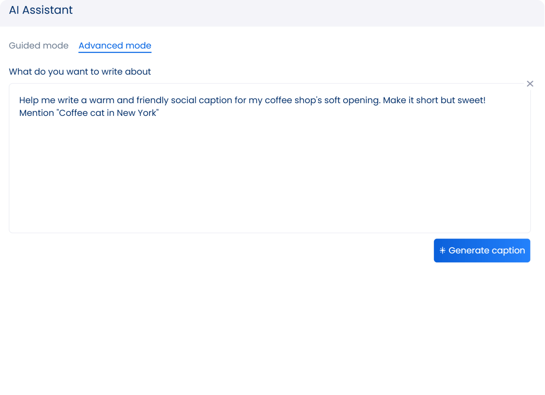 In the AI Assistant’s Guided mode, write or paste your original caption and choose the tone you want so the output stays aligned with your client’s brand voice.