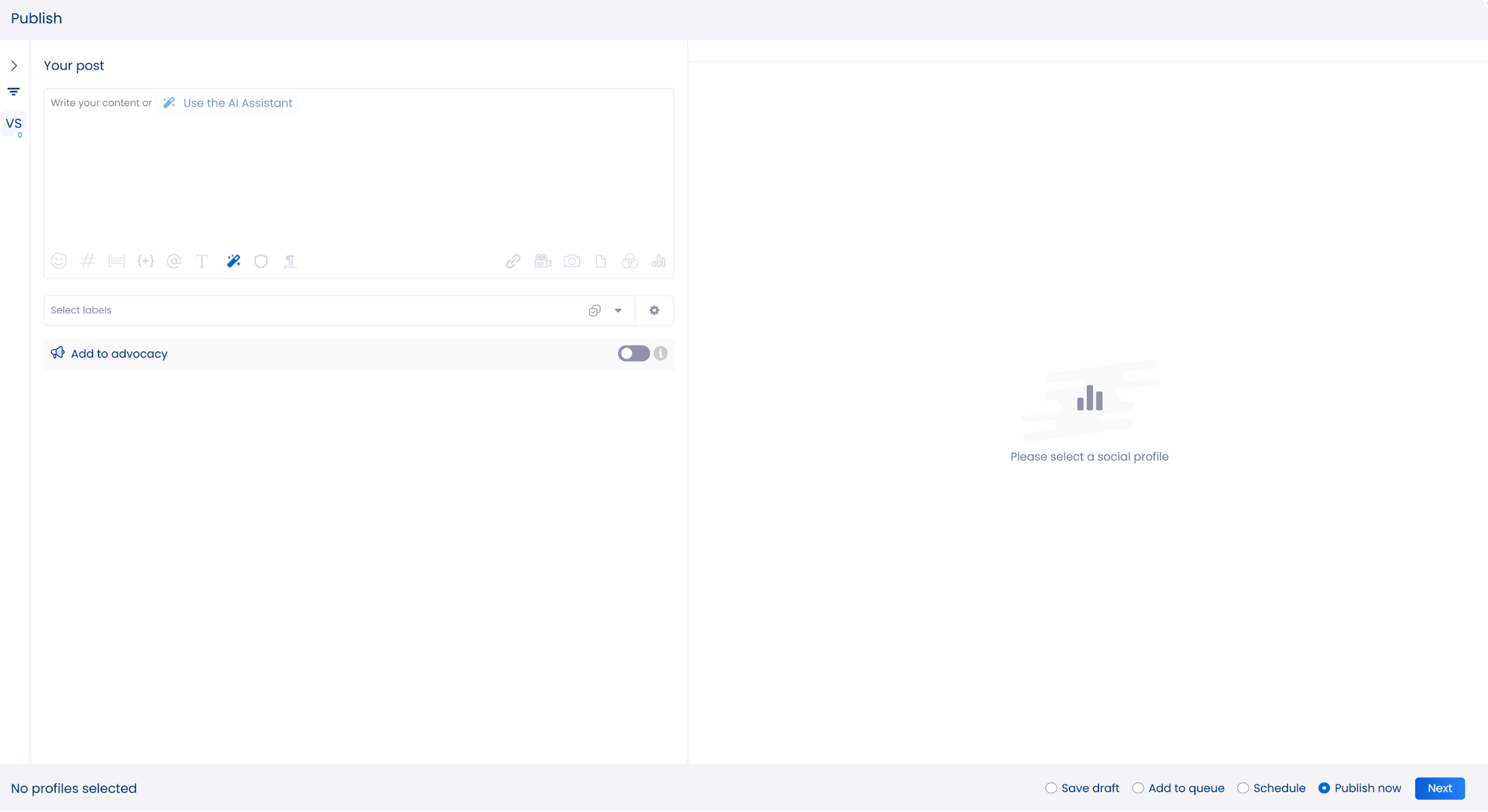 Go to the platform’s social media publishing feature (Publisher) to use the AI Assistant to generate post captions.