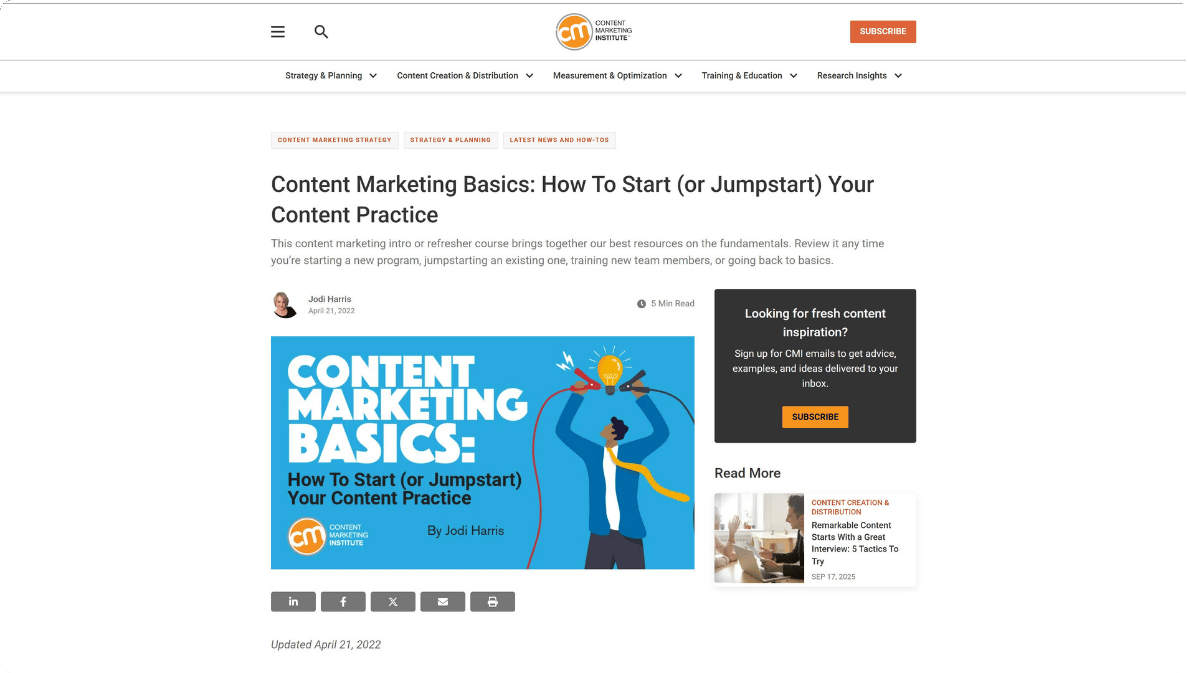 Content Marketing Institute’s guide teaches strategy fundamentals that don’t change over time. Their approach covers core ideas like setting goals, finding your audience, and making plans.