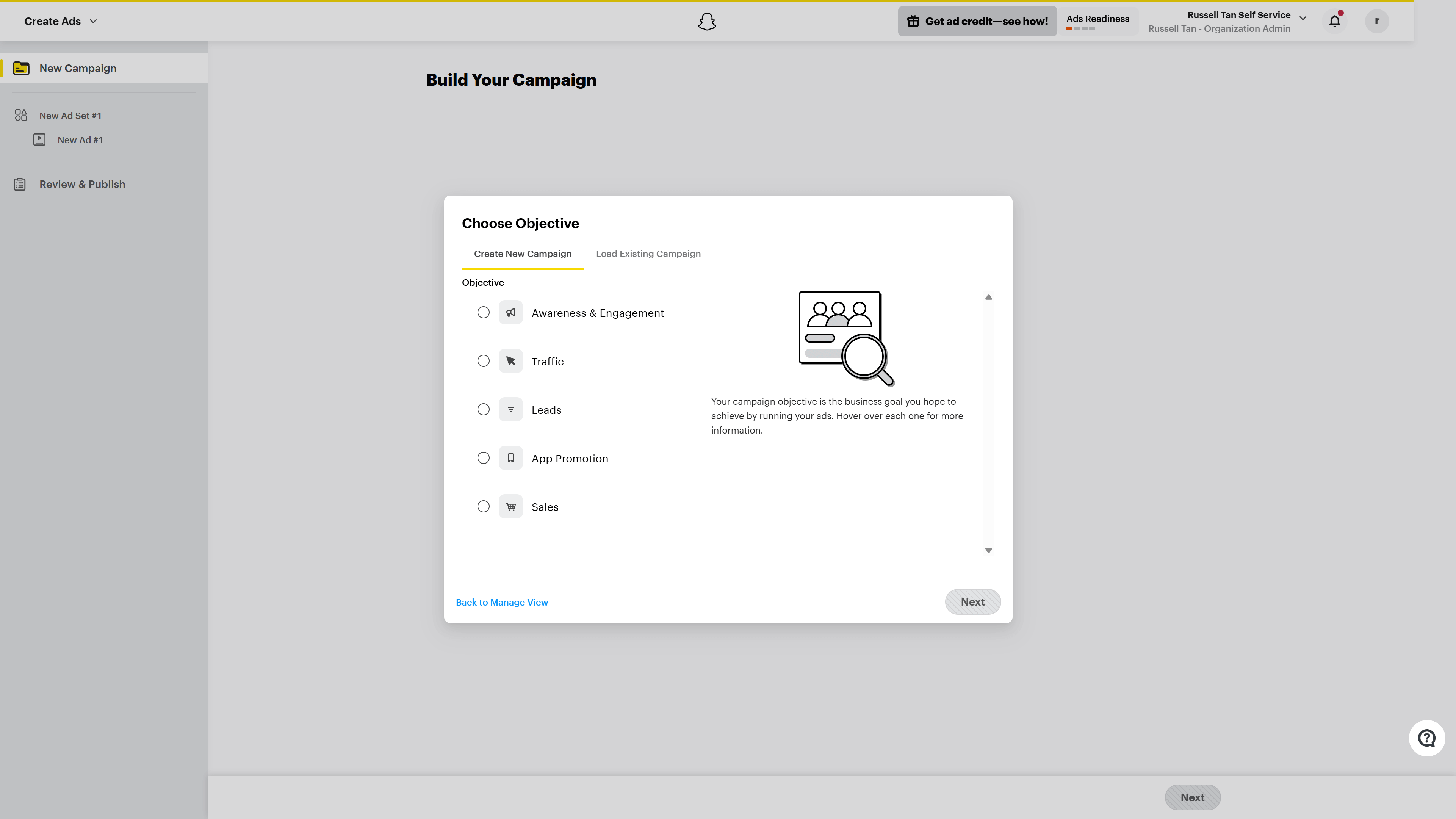 Once you’ve properly filled out the initial details, you should be redirected to this page where you get to build out your campaigns. Simply select your objectives and start creating ads for Snapchat!