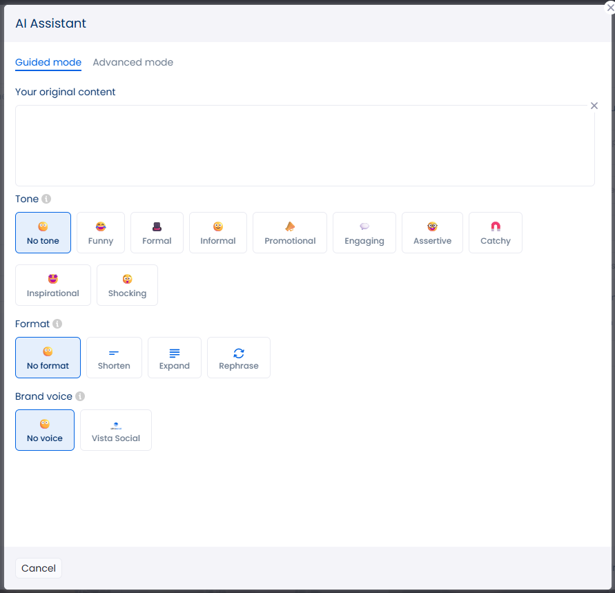 Vista Social’s AI assistant can help you create compelling hooks tailored to your brand voice and audience. Head to your Vista Social settings to create your brand voice so the AI assistant can consistently use the same style for all of your captions.