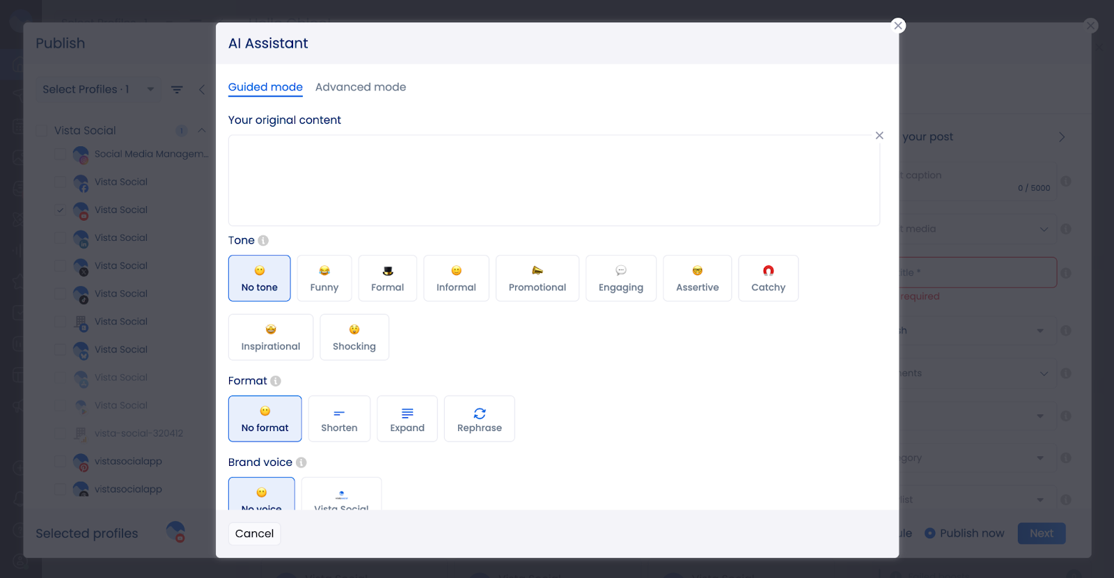 Pro tip: Vista Social’s AI assistant helps marketers understand which caption styles work best with their audience. This approach gets rid of guesswork and helps brands focus on what actually drives results.