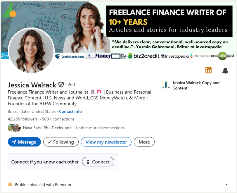 Jessica includes her portfolio by mentioning prestigious publications she’s written for. The money and house emojis immediately signal her specialty area. She also promotes her community to show she’s building her own platform beyond client work.