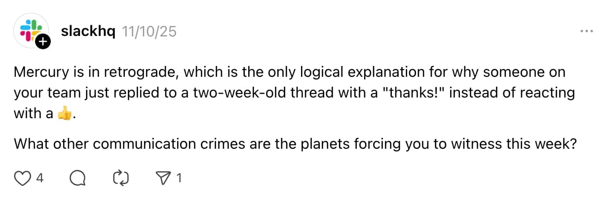And this post on Threads from team communication app Slack is another example of what social media marketing can look like: