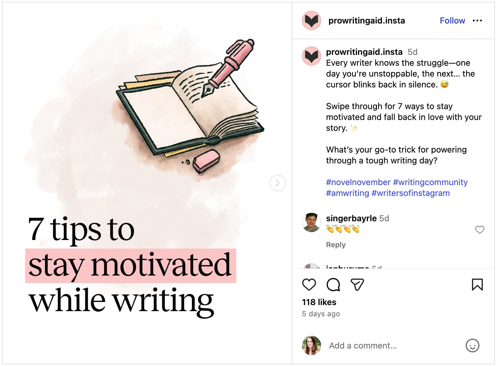 - Content example: ProWritingAid is an app made to help writers, well, write. The brand shares writing tips across its Instagram, and this carousel is a perfect example.