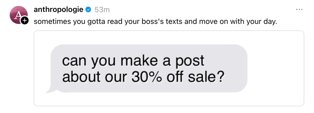 - Content example: Threads is perfect for sharing quick, humorous quips, and Anthropologie does a great job that with its content, as you can see below.
