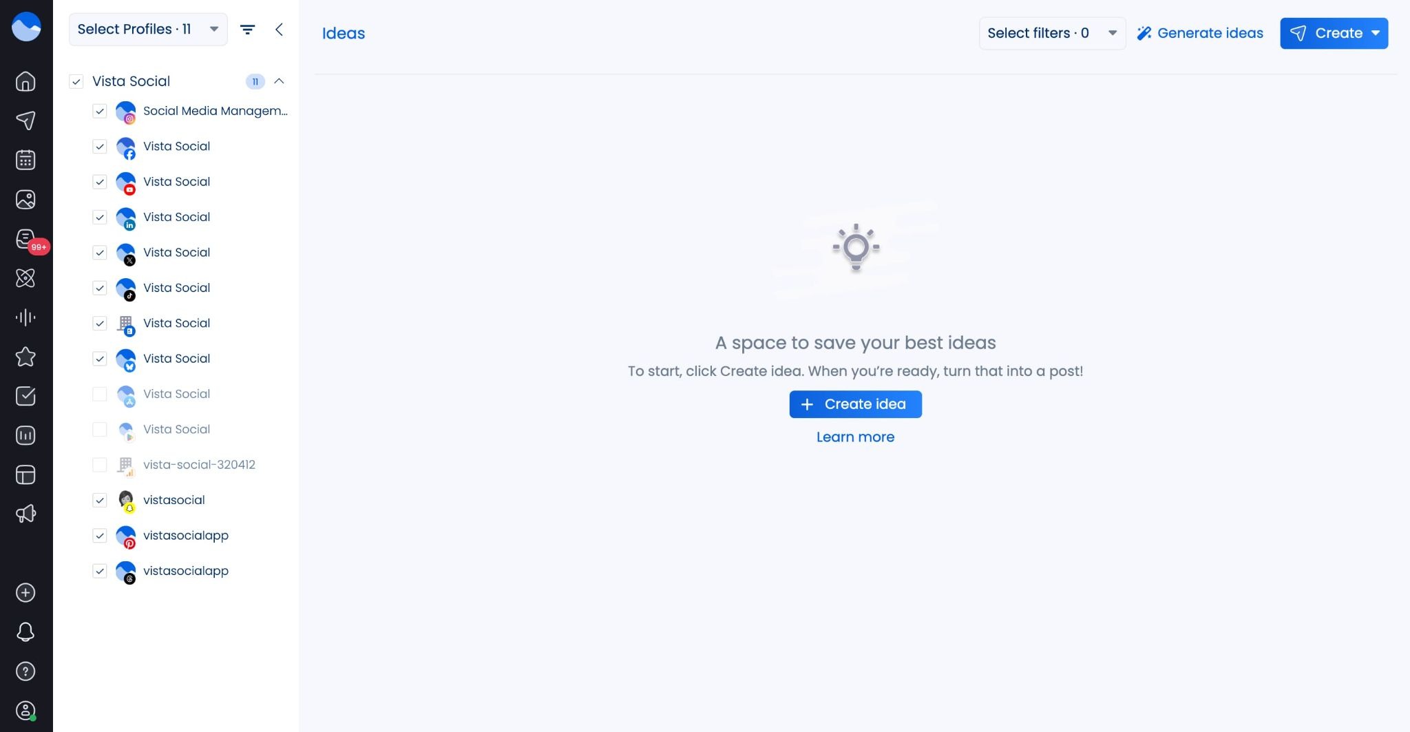 Pro tip: Vista Social’s dashboard includes an ideation area that can house all of your planned post ideas plus help you generate even more ideas.